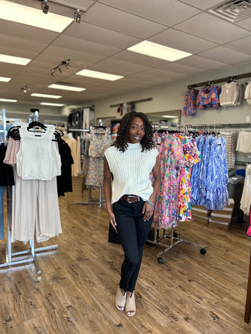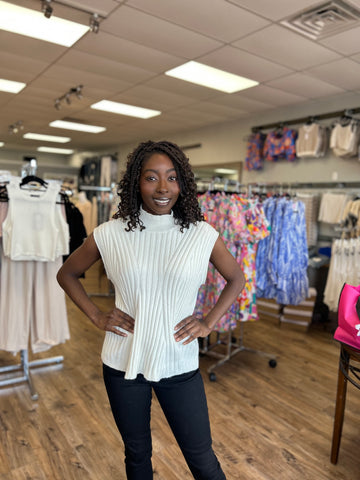Elevate your wardrobe essentials with The Elias Ribbed Top, a sophisticated sleeveless knit crafted in a versatile cream-white hue. With its structured turtleneck, defined ribbed texture, and relaxed silhouette, this top brings effortless polish to both casual and elevated looks.