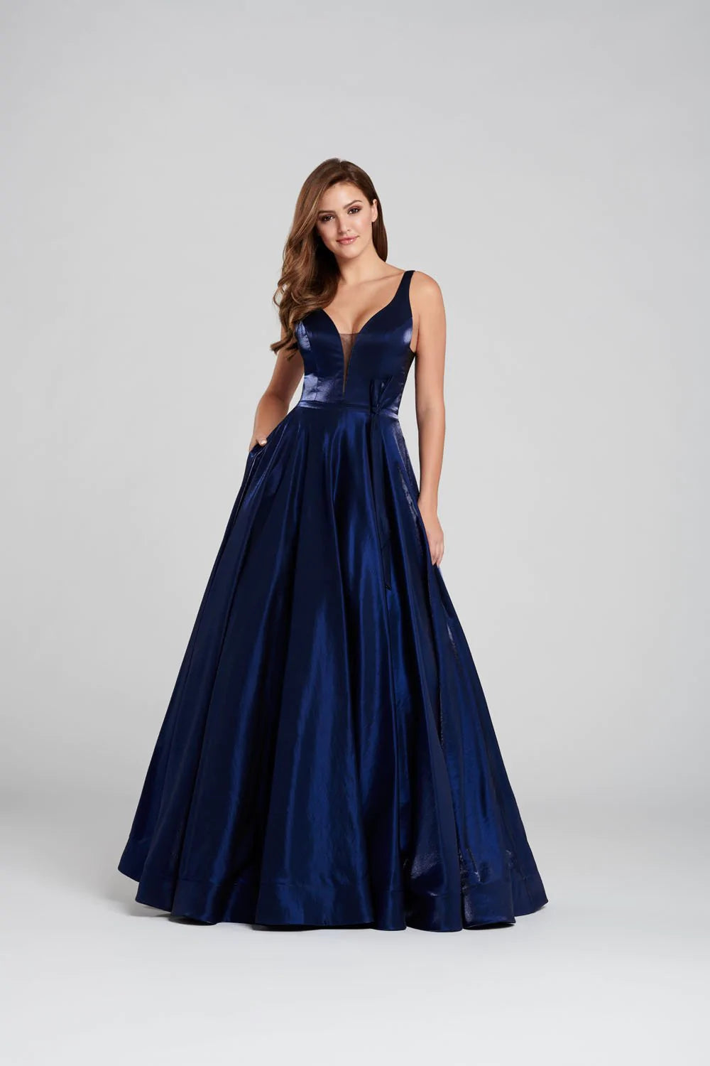 Create a striking entrance in our Mon Cheri EW120087 ball gown. Crafted from shimmer satin, it features a plunging v-neck and sheer side insets, plus a natural waist with a decorative bow detail. A scoop back and horsehair hem provide effortless movement, while the sweep train and convenient pockets add the perfect finishing touches.