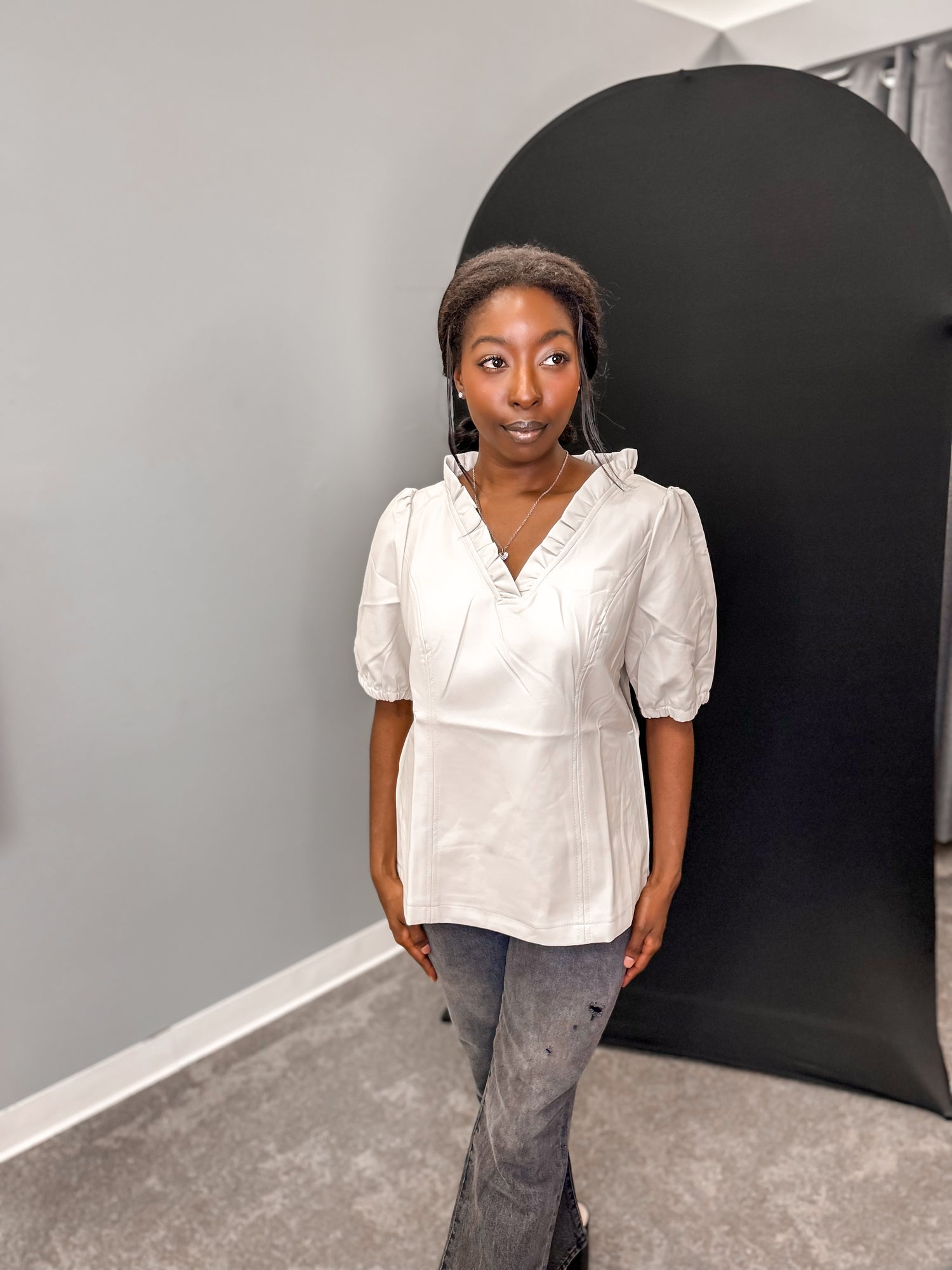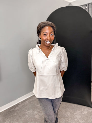 Unleash your inner fashionista with this unique Faux Leather Ruffle Top. The cream color adds a touch of elegance while the faux leather material and ruffled v-neck and puff sleeve details make a statement. Perfect for any occasion, this top is a must-have for anyone looking to add a touch of edgy glamour to their wardrobe.