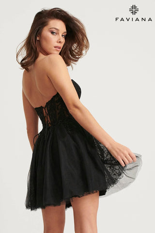 Indulge in the romantic elegance of Faviana 11120! This beautiful tulle and lace corset dress boasts a form-fitting A-line skirt and a flattering lace up back. Perfect for homecoming, this dress will make you feel like a fairy tale princess all night long.