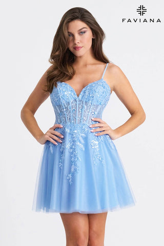 Faviana 11305 – Sparkle Tulle Corset Short Dress with Floral Appliqué