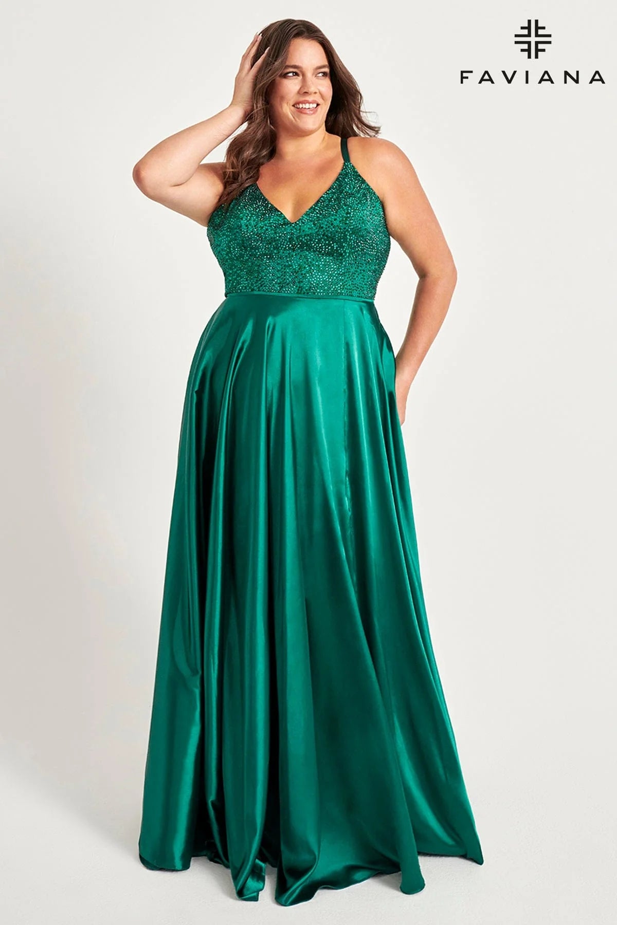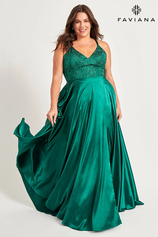 Be the star of the prom or Mardi Gras with Faviana 9524! Flaunt your curves in this rhinestone embellished, flowy a-line dress with a trendy slit. Turn heads with the hottest style of the season and stand out in a sea of classic silhouettes. Sparkle and shine with Faviana 9524!
