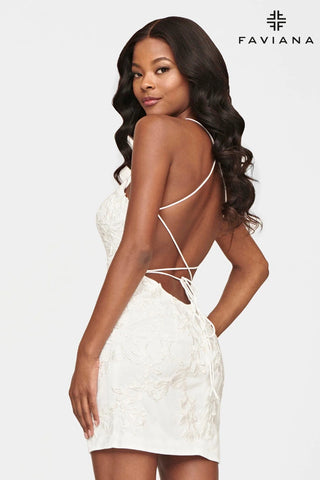 The perfect short dress for any occasion! Faviana Style S10602 has a flattering scoop neckline, adjustable lace-up back, and beautiful lace and stone appliques throughout.