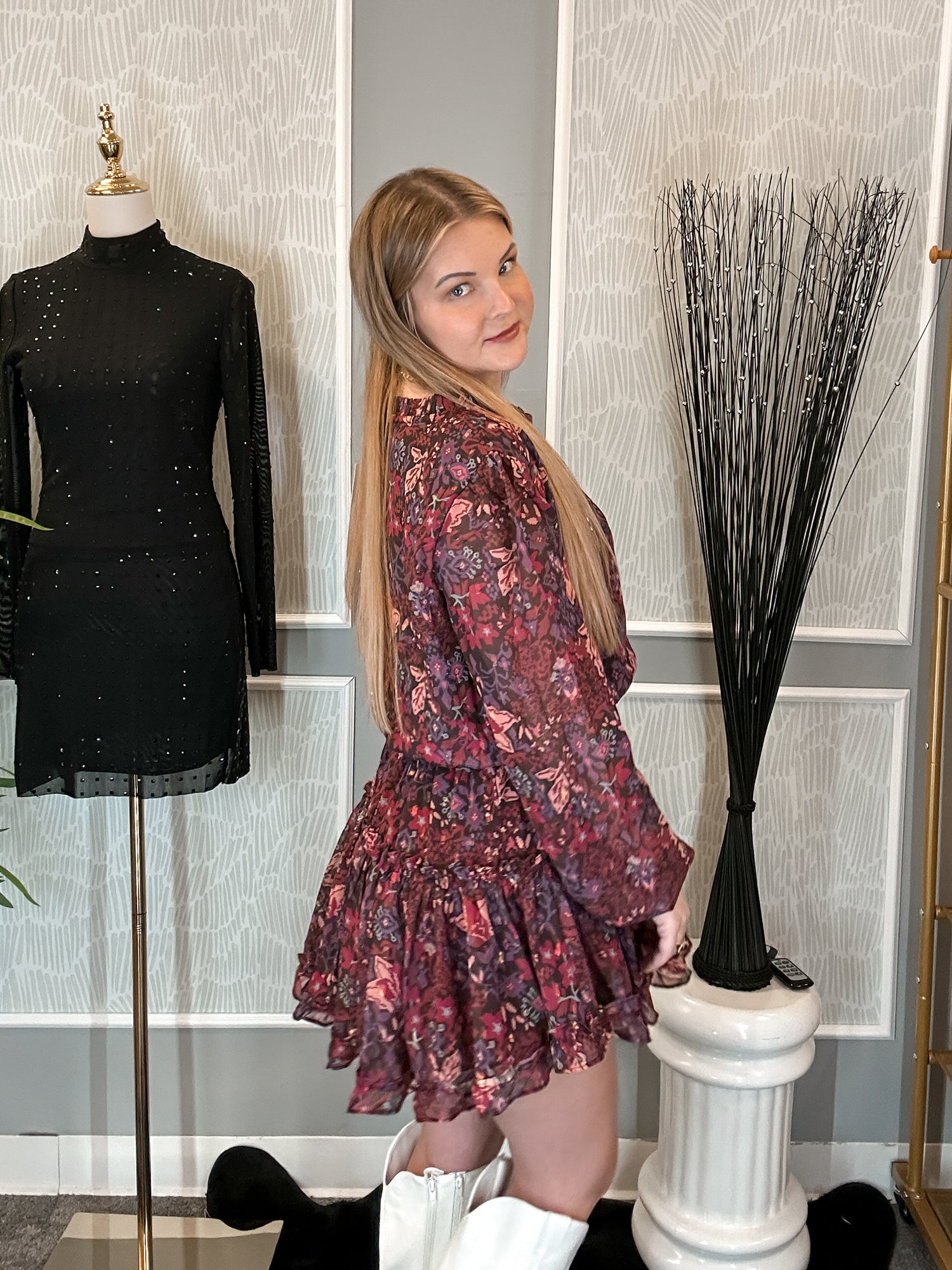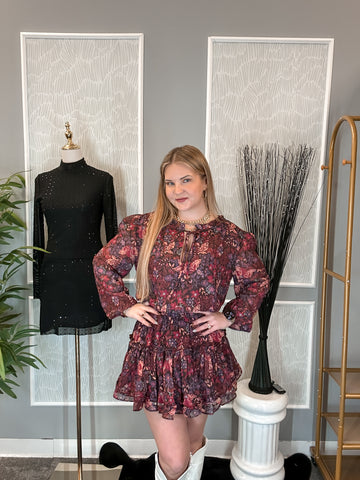Romantic and effortlessly chic, the Freya Dress from Sincerely Ours is a must-have for your fall and winter wardrobe. This flowy mini dress features a stunning midnight floral print in rich shades of burgundy, plum, and navy — the perfect mix of bold and feminine.