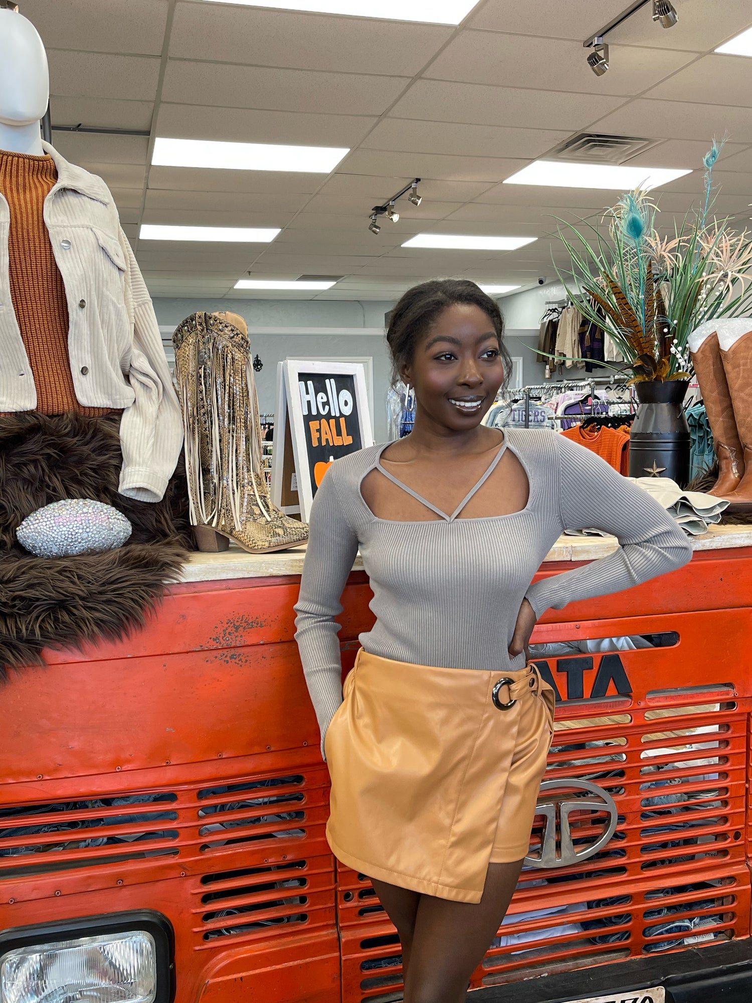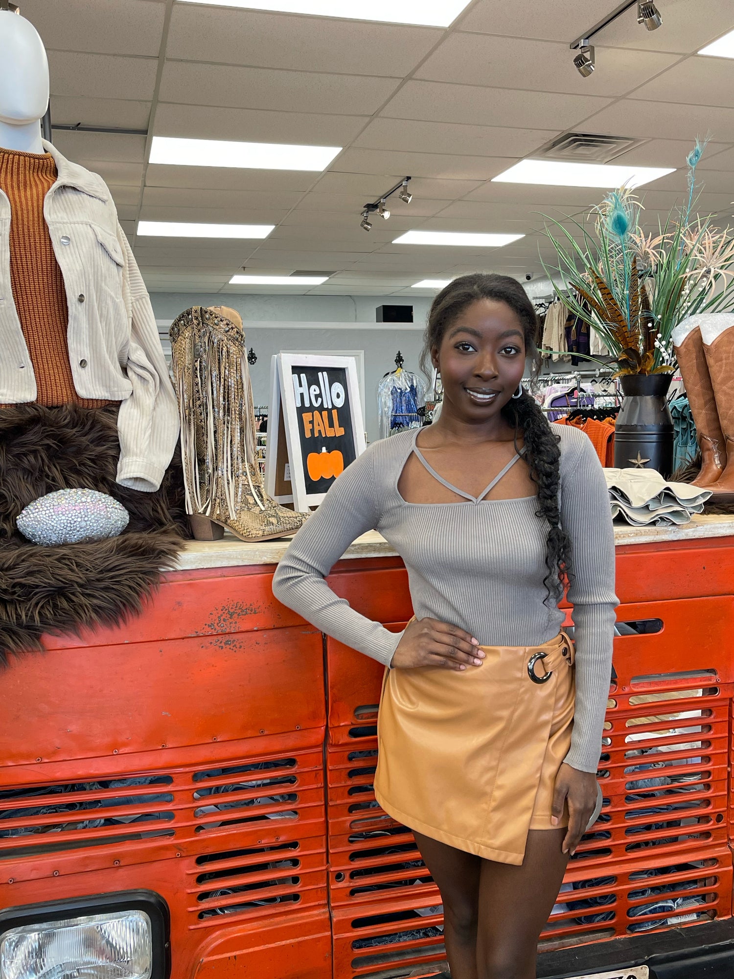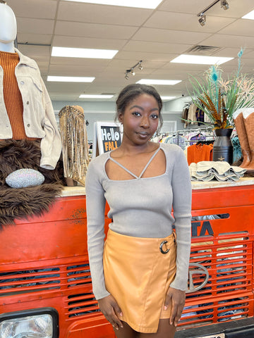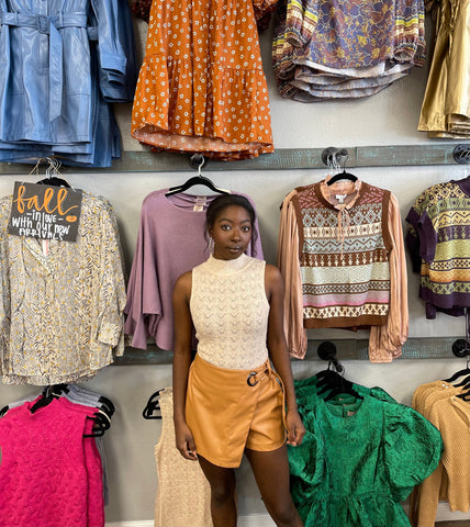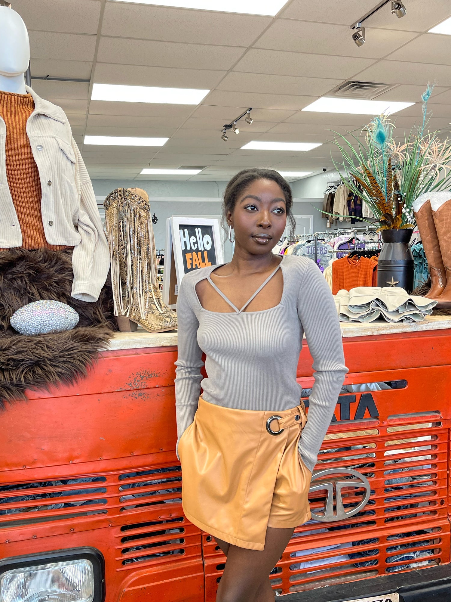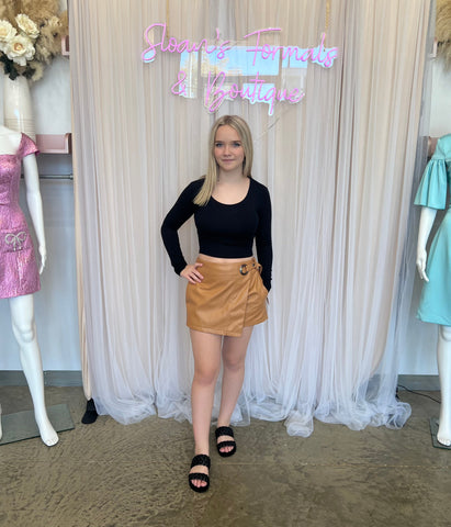 Who is ready for Fall? This caramel colored skort is perfect for those dates to the pumpkin patch! Pair with your fav riding boots and a sweater or a sweater vest for a trendy look!