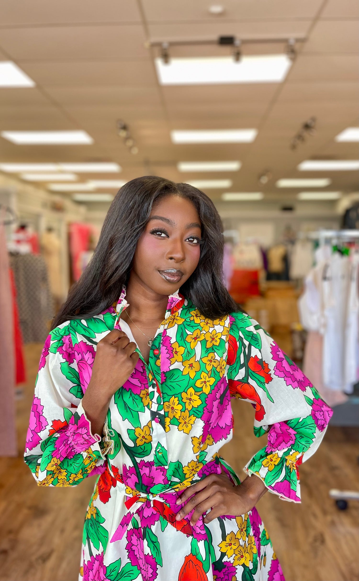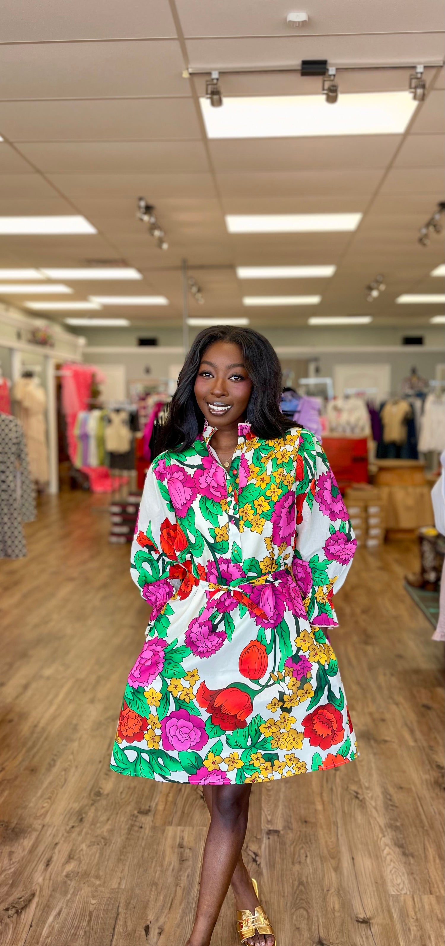 Discover the vibrant and playful Ivory Rooftop Garden Adelina Dress! This boutique dress features flattering cuff sleeves and a unique ruffle neck design with a back tie that cinches the dress for a perfect fit. Perfect for spring and summer, this dress will make you stand out with its stunning multi color print. Add beauty to your wardrobe with this must-have piece!