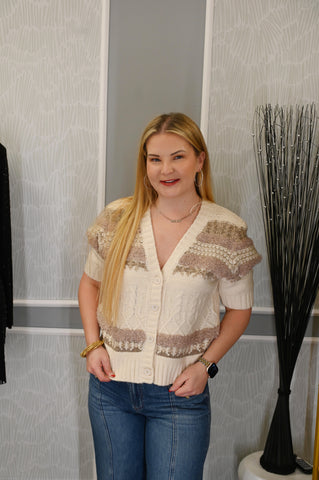 Cozy meets chic with the Steve Madden Janae Cardigan, the ultimate knitwear piece for effortless everyday style. Featuring a soft knit fabric with subtle stripe detailing, this short-sleeve cardigan offers a modern twist on a classic layering essential. With its button-front design and fitted silhouette, the Janae Cardigan is as versatile as it is stylish—perfect for pairing with denim, skirts, or trousers.