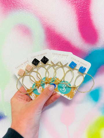 The Jessie Hoops earrings bring the perfect combination of shimmer and style. Crafted with iridescent materials, these hoops and rectangle-shaped earrings will add a flash of elegance to every outfit. Make a statement with these dynamic pieces of jewelry!