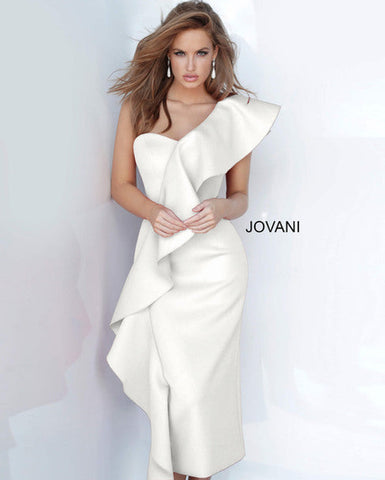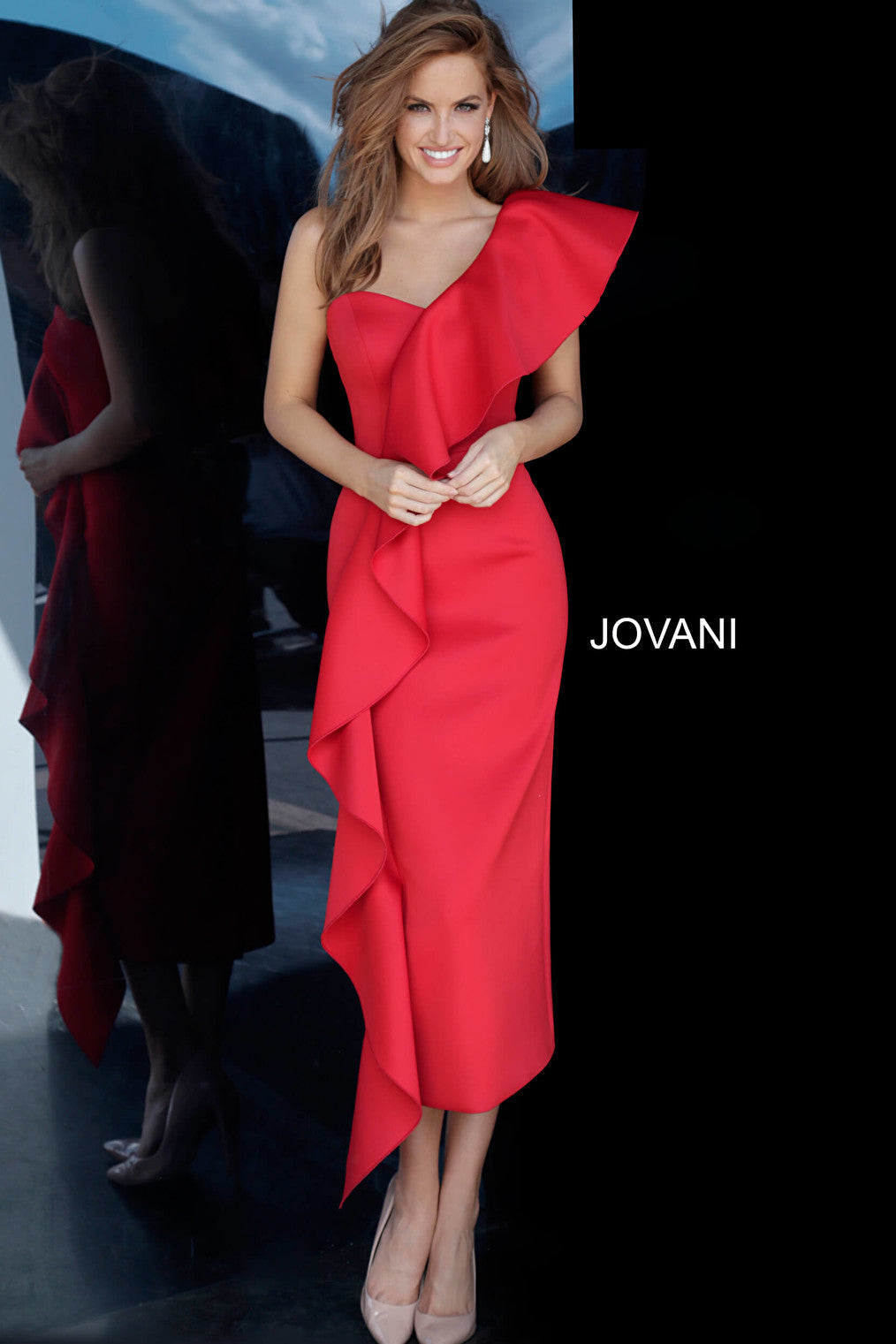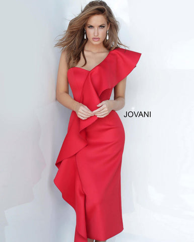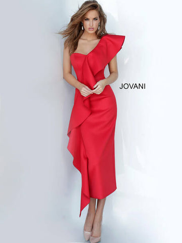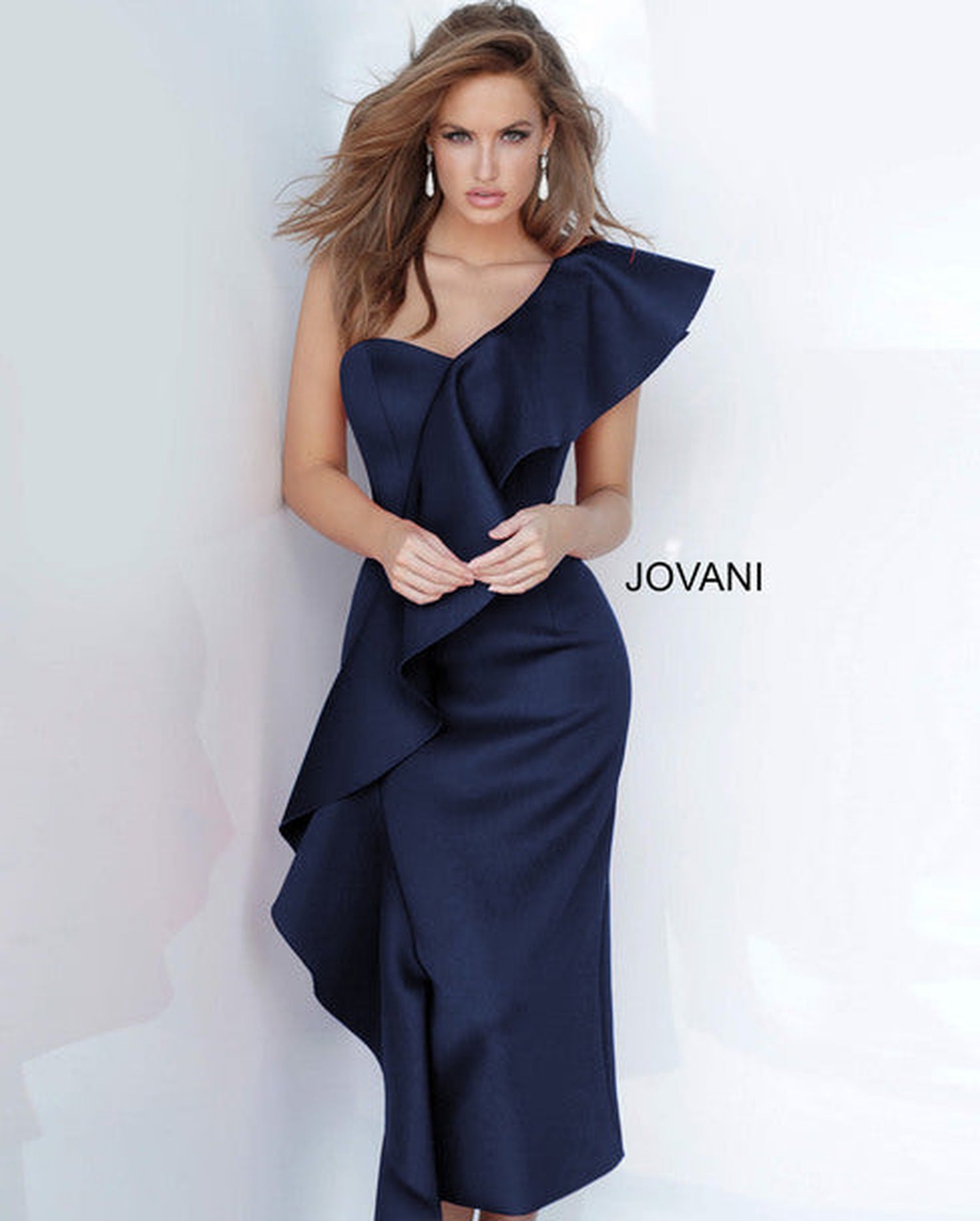 Feel elegant and confident in the Jovani 02616! This stunning dress features a tea-length design, fitted silhouette, and one-shoulder neckline with charming ruffled edges. The center back slit adds a touch of allure to this classy piece. Perfect for any special occasion, this dress will make you feel stylish and sophisticated.