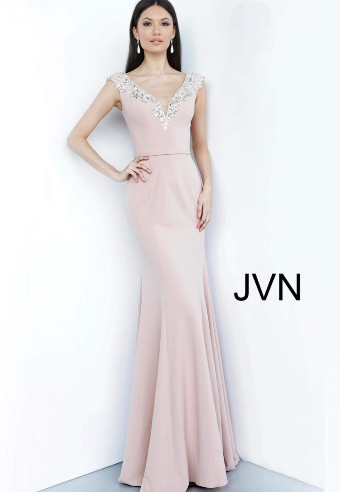Feel like a shining star in the Jovani JVN02629 long gown! The cap sleeves and v-neckline add a touch of elegance, while the embellished sparkling stones truly make you stand out. Feel confident and glamorous in this stunning dress!