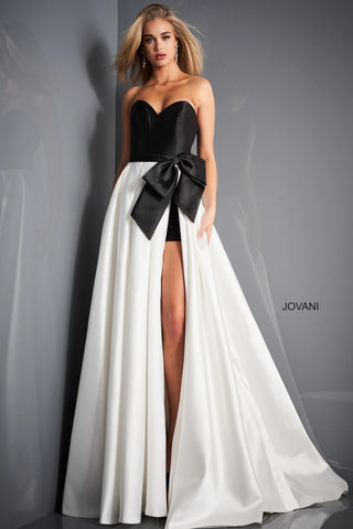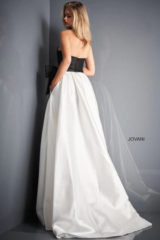 The Jovani 03139 is a beautiful long formal gown crafted from black and ivory for a timeless look. It features a strapless design for a sophisticated feel and a big bow on the waist for an elegant touch. Plus, the high slit ensures you will look and feel graceful at your next event.