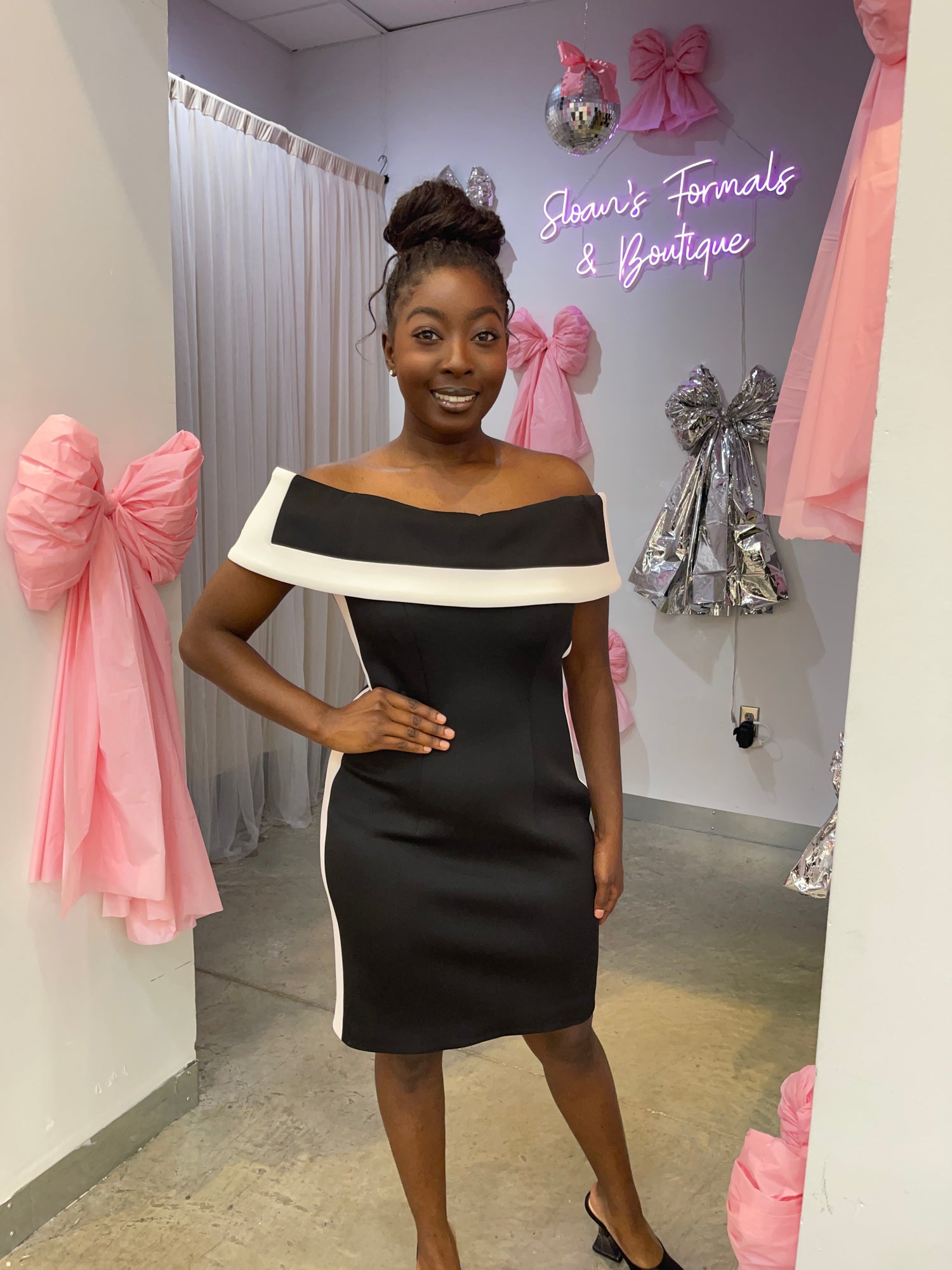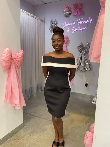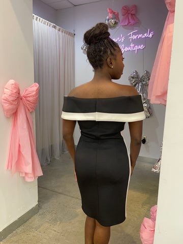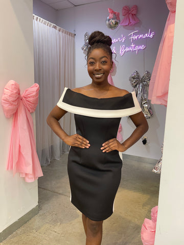 Experience timeless elegance in the Jovani 03569 black and white short dress. The fitted silhouette and two-tone fabric exude sophistication, while the foldover off-the-shoulder neckline adds a touch of modern flair. Perfect for any formal event, this dress will make you stand out in a crowd.