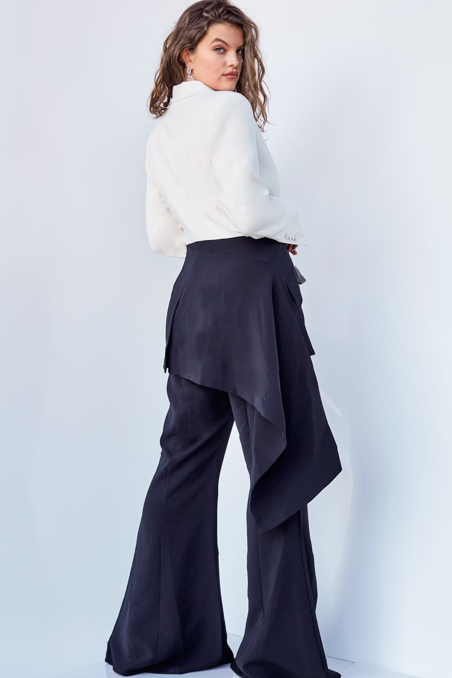 Experience elegance and modern style with our Jovani 04148! This long sleeve suit features a low v-neckline, fit-and-flare pants, and a front slit in the top for a touch of glamour. The side tails on the top add a unique and sophisticated look to this outfit. Elevate your wardrobe with this chic and versatile piece.