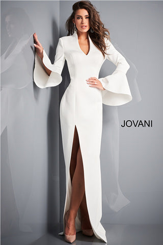 Elevate your look in timeless elegance with Jovani 04240. This luxurious mother of the bride dress features bell sleeves, a form-fitting silhouette, and a chic floor-length skirt with a high slit. An exquisite v-neckline collar adds to the sophistication. Style and sophistication come together with this exquisite gown.