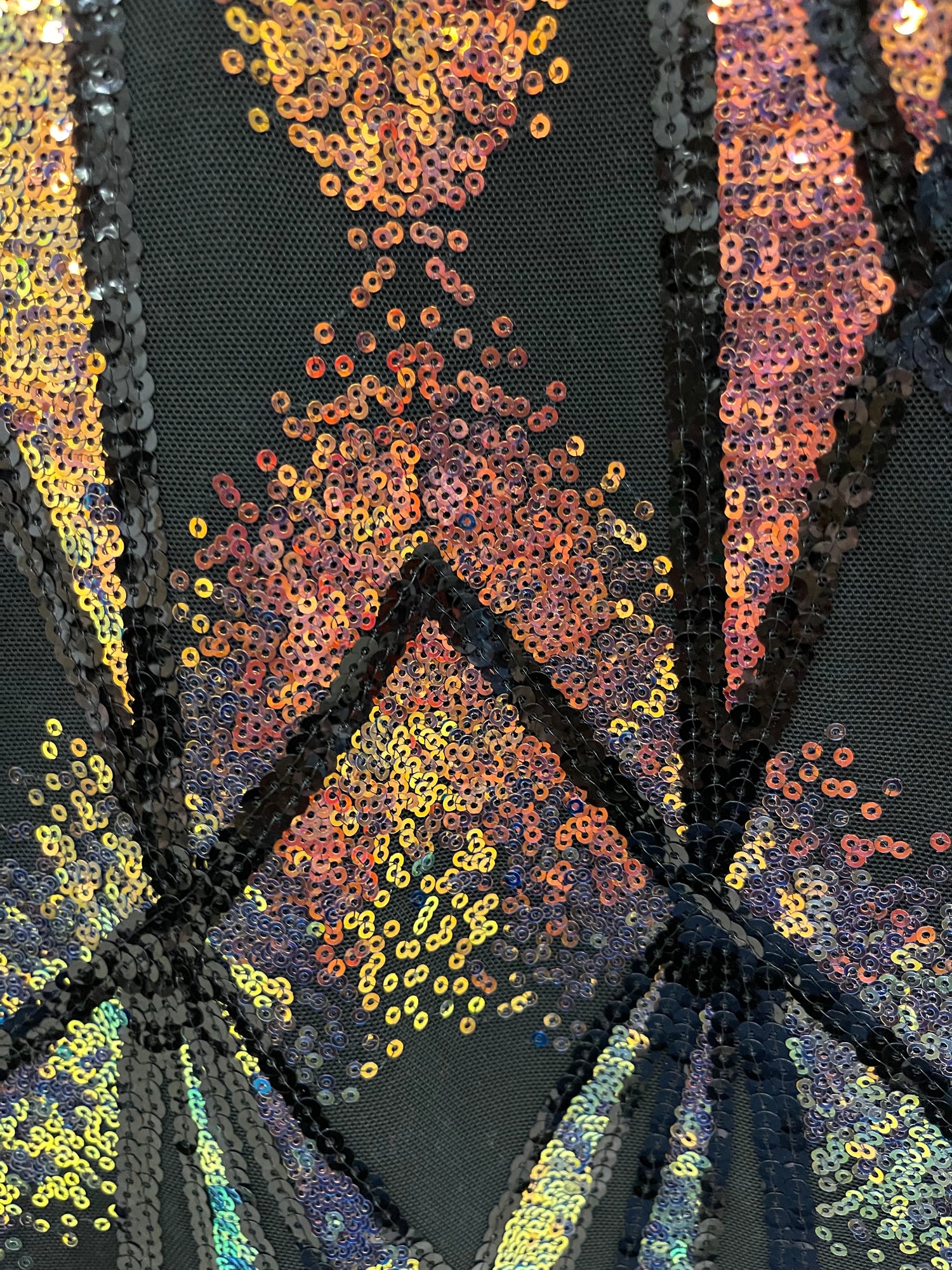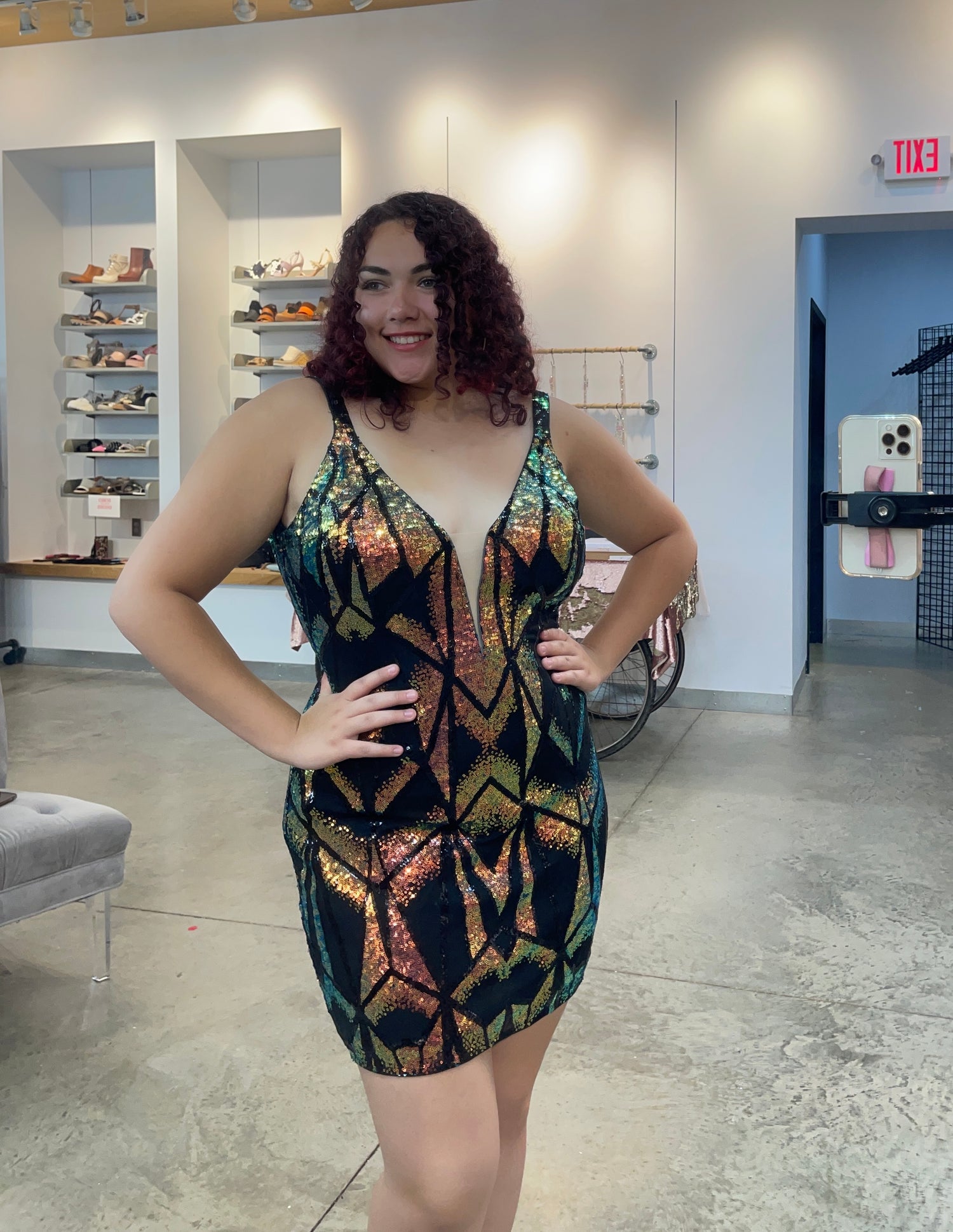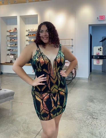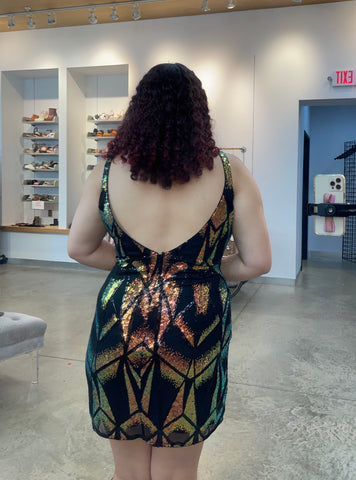 This stunning Jovani 05102 dress features a fitted silhouette that will accentuate your curves, along with a geometric sequin pattern that will catch the light with every move. The plunging neckline and open v-back add a touch of sultriness to this elegant and glamorous dress. Elevate your style and turn heads at your next event with this show-stopping gown.