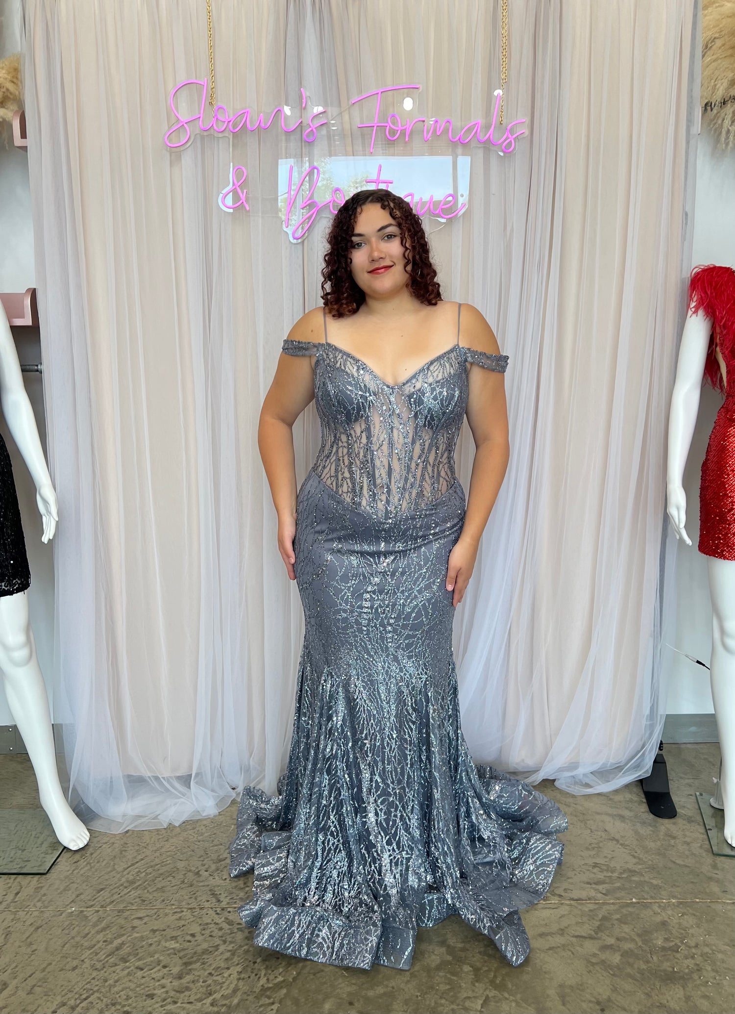 Get ready to sparkle on your special night with the Jovani 05838! This stunning prom dress features glitter embellishments, a fitted silhouette with a flared bottom, and a corset sheer bodice for a touch of elegance. With an off-the-shoulder plunging neckline and spaghetti straps, you'll be sure to make a statement. (Shine bright like a diamond!)