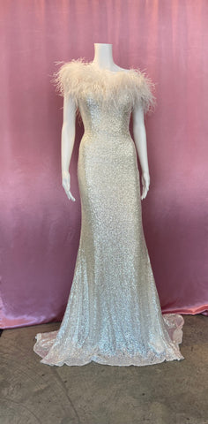 Sparkle and shine in the Jovani 06166 dress. With its gorgeous off-the-shoulder neckline and fully sequined design, you'll be the star of any formal event. The feathers around the neckline add a touch of whimsy, while the fitted silhouette flatters your figure. Get ready for a night of glamour and style!