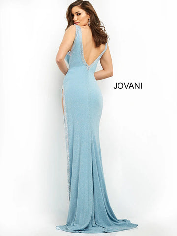 This stunning Jovani 06276A dress features a glittery material, adorned with AB stoning, making you shine like a star at any event. The high slit and plunging neckline add a touch of fun to your ensemble. Make a statement and turn heads with this captivating dress.
