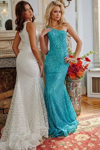 Get ready to shine in the Jovani 06517! This stunning prom dress features intricate sequin embellishments and a flattering sheath silhouette. The floor-length skirt is slightly flared with a small train and horse hair trim, making it perfect for dancing the night away. The sleeveless one-shoulder bodice and sheer sides add a touch of elegance to this eye-catching dress. Who says prom can't be fun and glamorous?