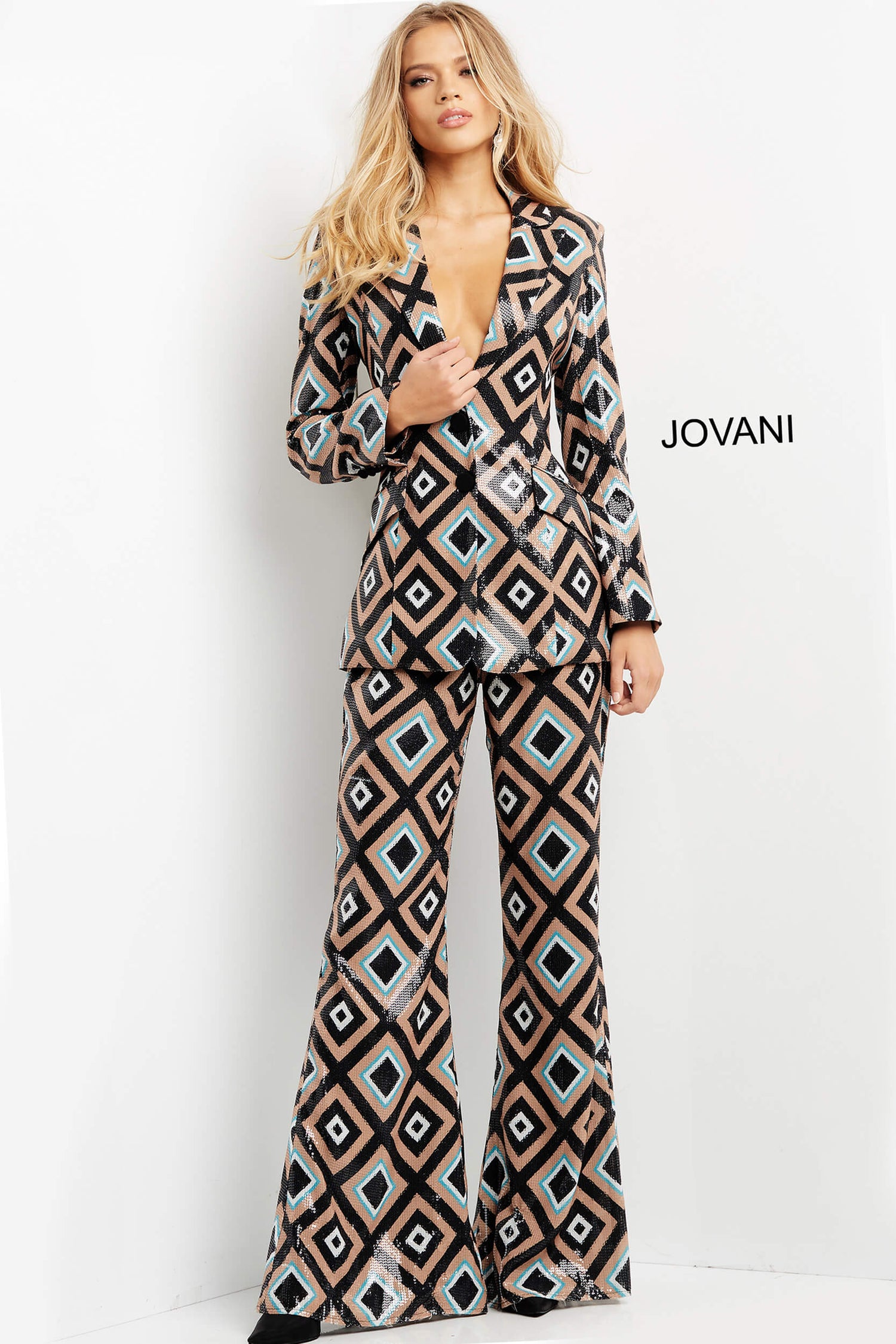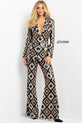 Look sharp in this stylish, formal printed suit from Jovani. The 07921 features flared pants for a flattering silhouette. Make a statement at your next special event with this fashionable and timeless classic.