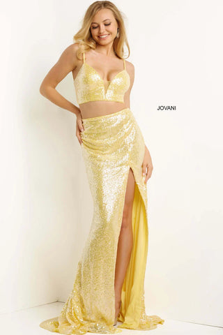 Look radiant in this stunning Jovani 08091 two-piece long formal. The fully sequined v-neck top with a lace-up back is figure-flattering to create an eye-catching silhouette. The fully sequined skirt with slit and train will make you feel like a princess with its glamorous design. Make waves with this exclusive design.