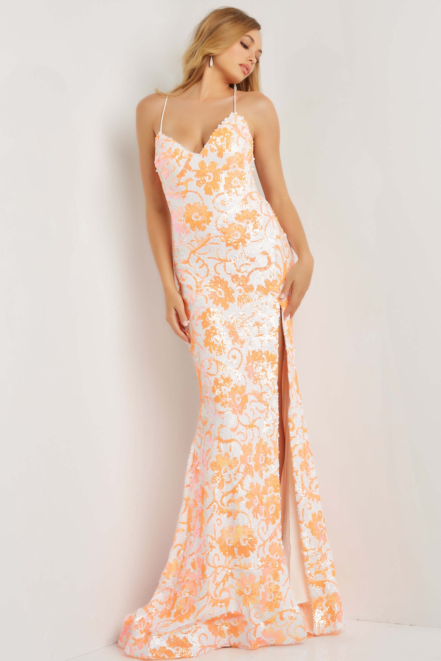 Look your best for prom in this gorgeous Jovani 08255 Sequin Floral Sheath Prom Dress. Crafted from a lustrous fabric, it features a long silhouette with a high slit for added glamour. The intricate floral sequin design ensures your moment is memorable.