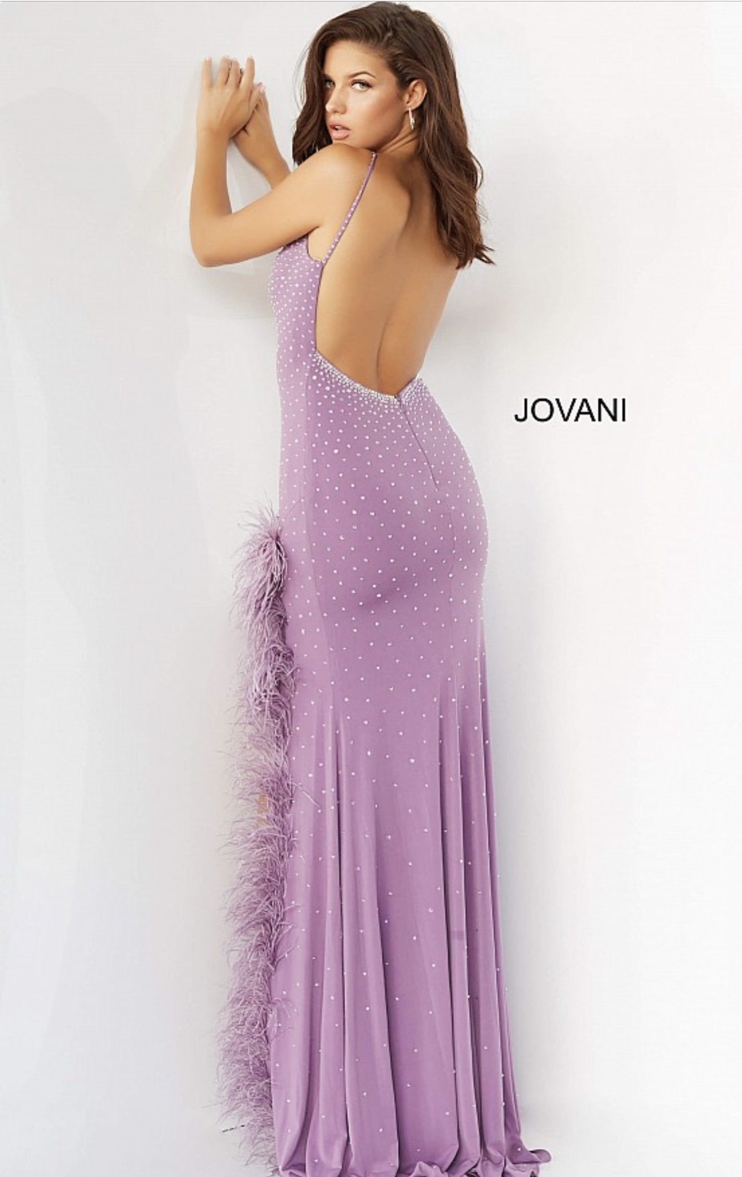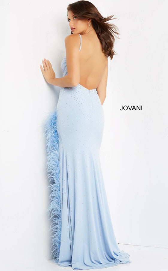 The Jovani 08283 is a long formal with a classic silhouette and modern details. This dress features a stunning rhinestone embellished bodice, a slit finished with feather detailing, and an open back. Perfect for a special occasion, this dress is sure to make you stand out from the crowd.