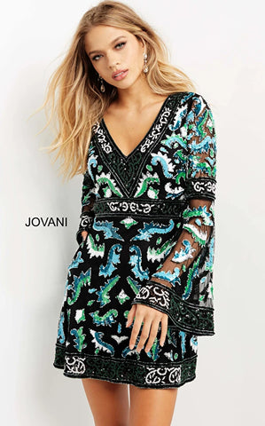 The Jovani 08448 dress offers a perfect blend of sophistication and style. The v-neckline and long bell sleeves imbue a timeless elegance, while the beaded design adds an extra touch of glamour. This short formal gown is guaranteed to make you look and feel your best.