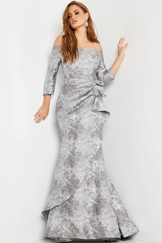 Be the belle of the ball in Jovani 09550. This exquisite off-the-shoulder mermaid gown features cascading, luxurious ruffles and side ruching for a beautiful silhouette. Three-quarter sleeves lend a timeless look, while the floor length cut gives you the opportunity to showcase your sophisticated style. Your guests will be in awe!