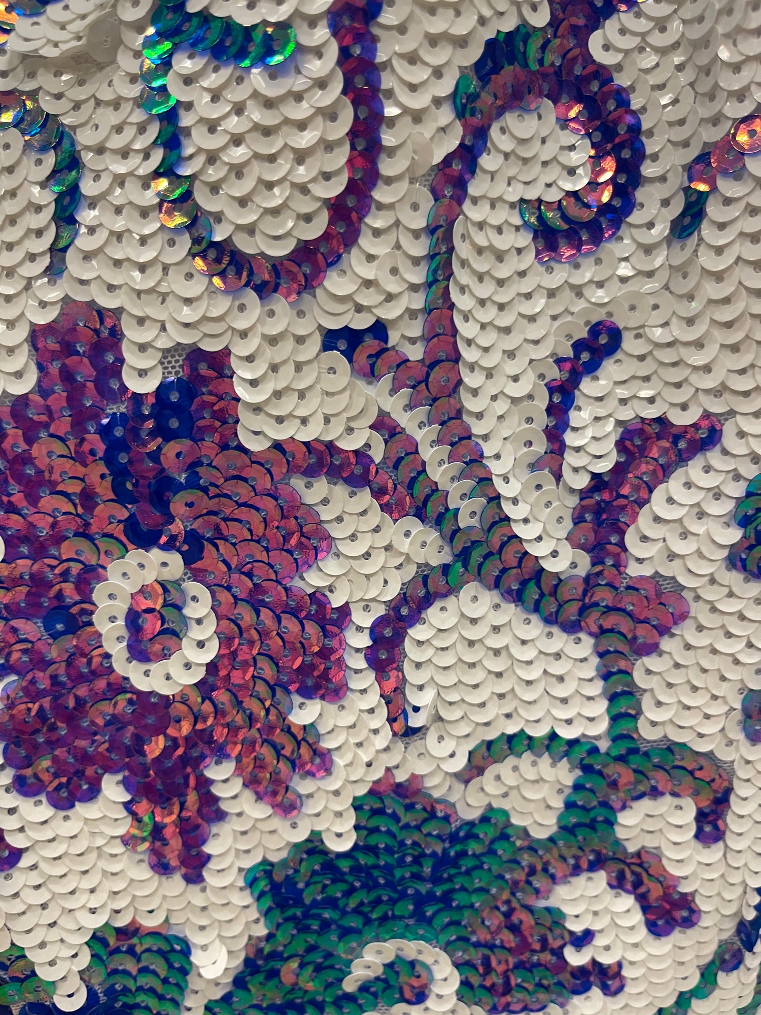 Discover the perfect prom dress with Jovani 09738. This white and blue floral sequin fitted short dress is sure to make you shine! Showcase your beauty and grace in this stunning design for the night of your dreams.