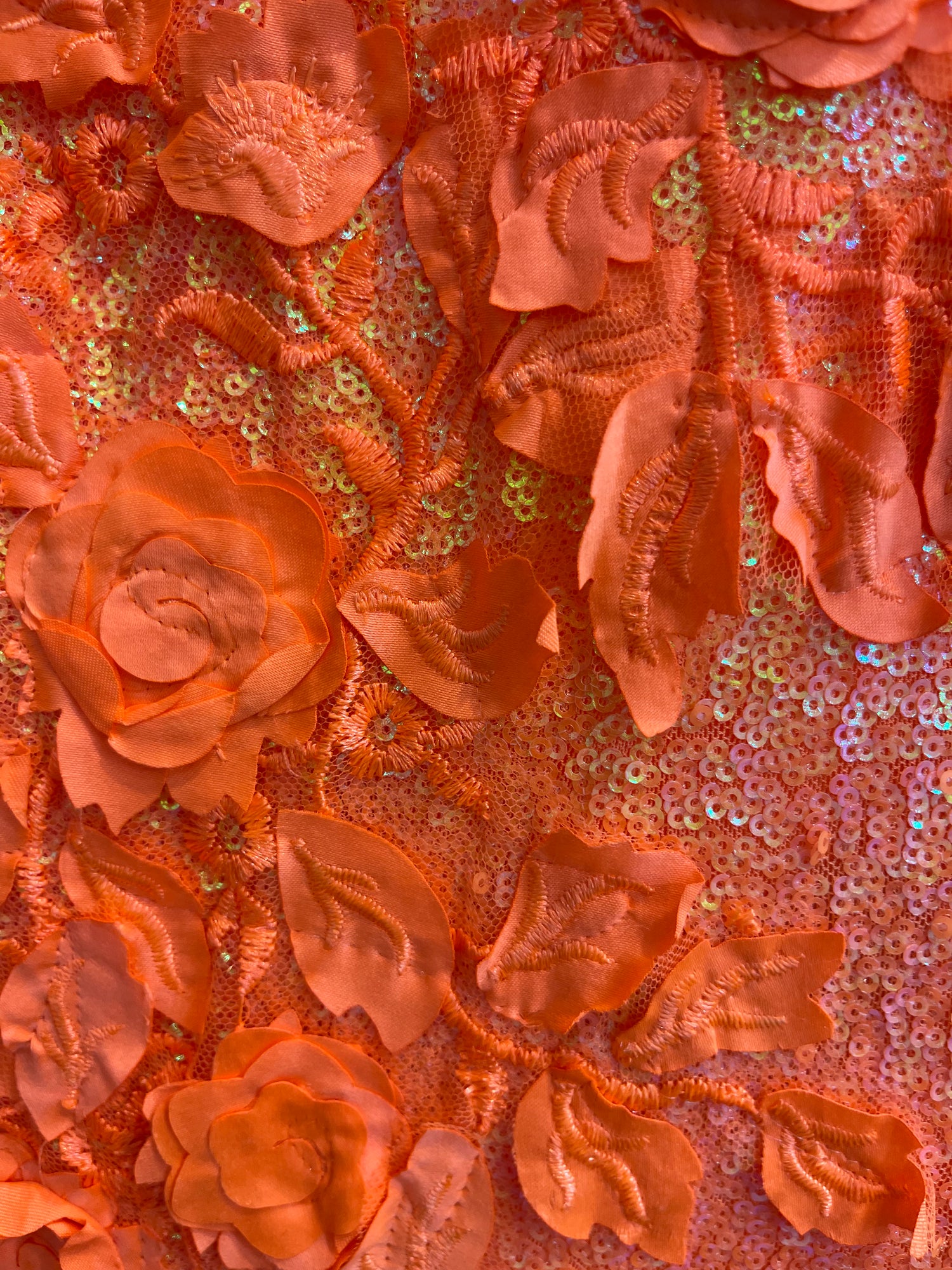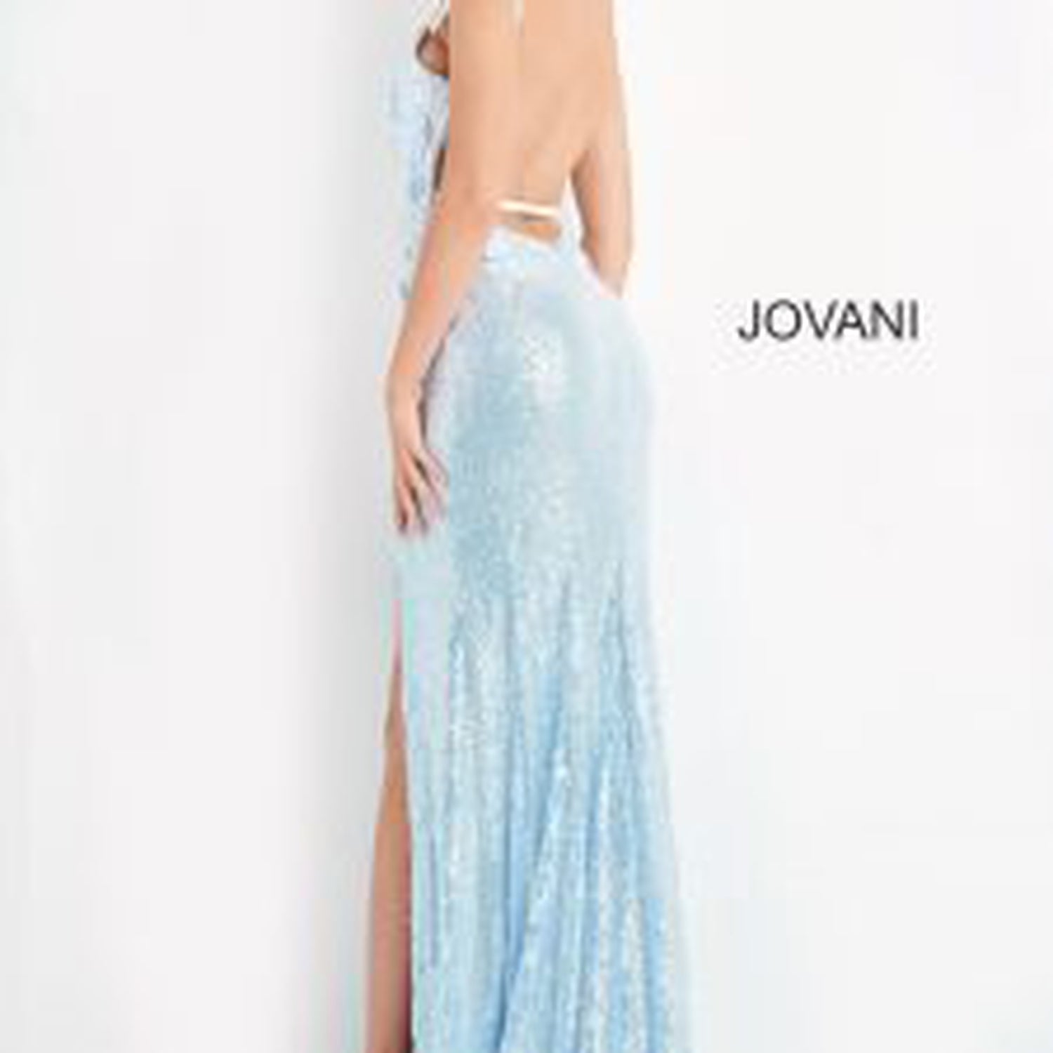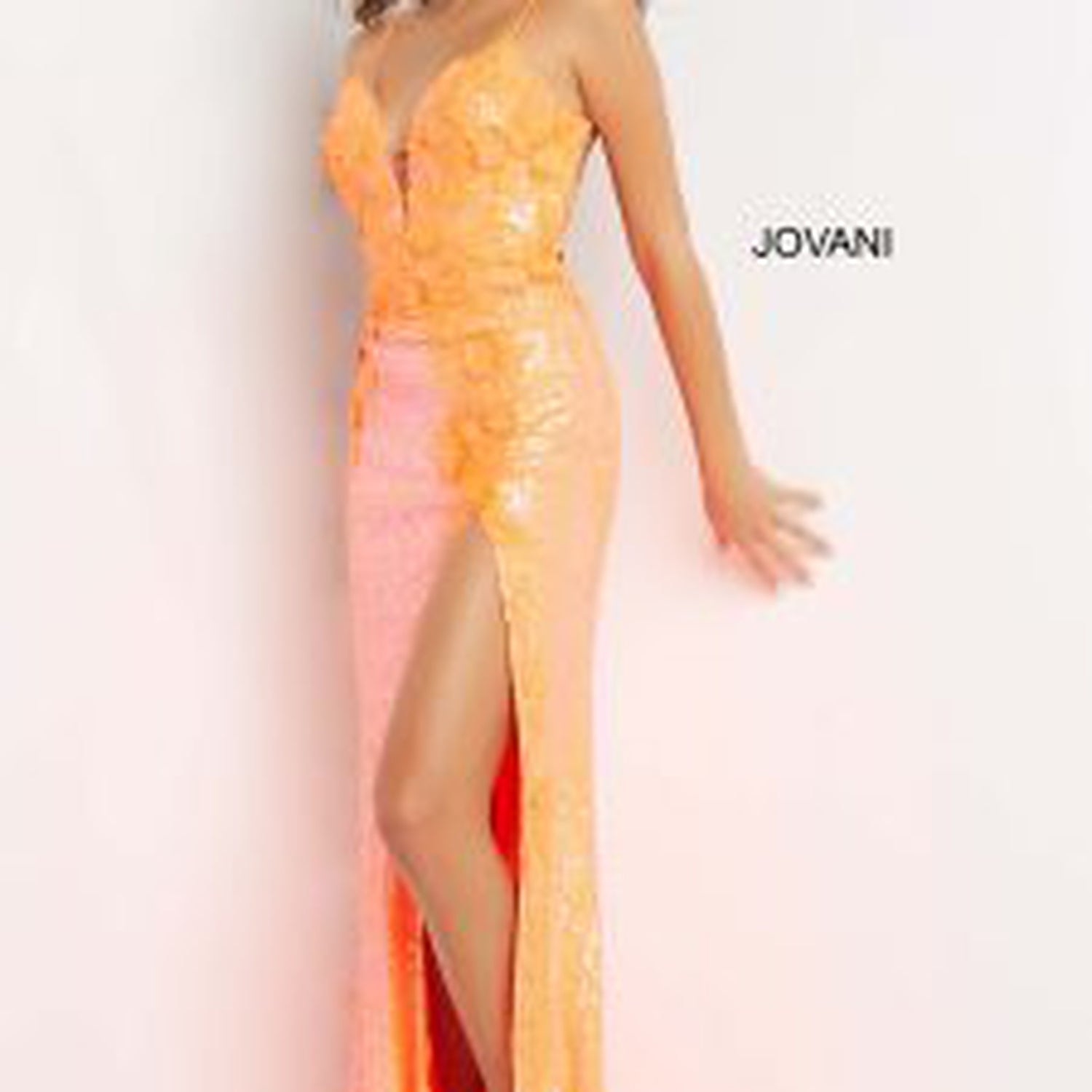 This Jovani 1012 dress is crafted from fine sequins and floral appliqués. The delicate design features a plunging neckline and a slit in the skirt for added allure. A small train in the back adds a dramatic touch. Perfect for proms and formal occasions.