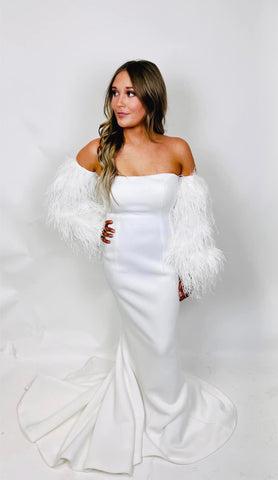 Let the feathers fly in Jovani 1226 – a breath-taking, fitted white formal gown with detachable feather sleeves! Its luxurious silhouette keeps you looking as fabulous as you feel, so you can dance the night away without worry. (And look great doing it!)