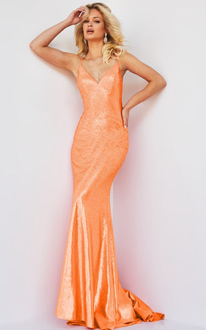 The Jovani 220110 is a glamorous long gown with a V Neckline. Crafted from a metallic fabric, this dress is adorned with sparkling rhinestone detailing, perfect for a special occasion. Experience the elegance of this exquisite evening wear.
