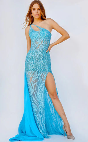 Experience luxury in this stunning Jovani 22602 one shoulder dress. Sparkly beads envelop the sleek silhouette, while a daring split and open back add a touch of allure. Elegant wings and a chic cape dare you to show off your glamorous side. Capture the night in this opulent showstopper.