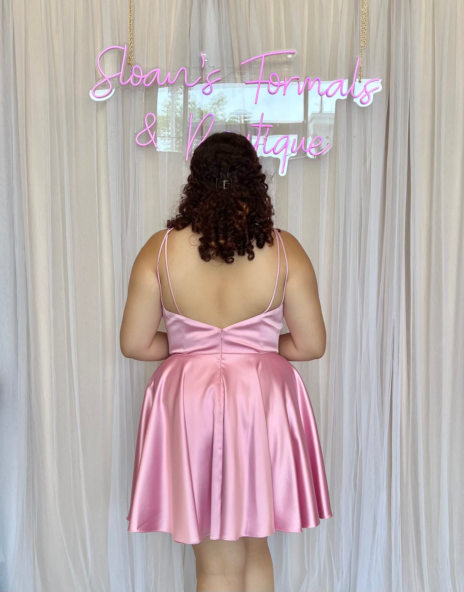 Fit and flare for the modest young lady. Fitted bodice with a unique strap detailing the neckline. This dress is finished with a circular skirt that hangs nicely and is flowy.