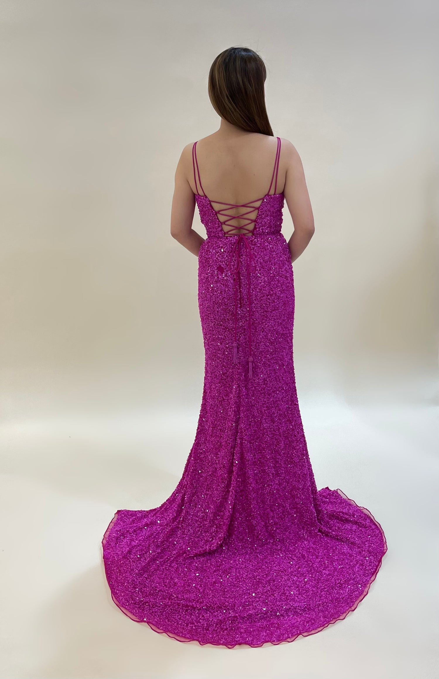 Look your best in Jovani 23148, a fully sequined form fitting prom dress with a thigh-high slit for added drama. Its fitted silhouette will flatter your figure, while the sparkle of the sequins will make sure you stand out in any room. Get ready to shine!