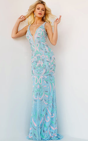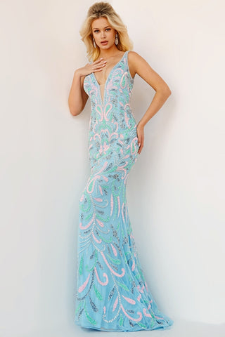 The Jovani 23511 features a beautiful light blue multi color fabric with a plunging neckline that is embellished for a shimmering, eye-catching design. Its flattering V neck design adds subtle elegance to the entire look. Perfect for any prom or formal event!