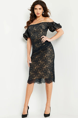 Be the life of the party in this Jovani 23812 off-the-shoulder cocktail dress! An eye-catching tea length lace dress is perfect for any special occasion, so you can twirl the night away and feel totally glamorous. Make a statement and let the lace speak for itself!