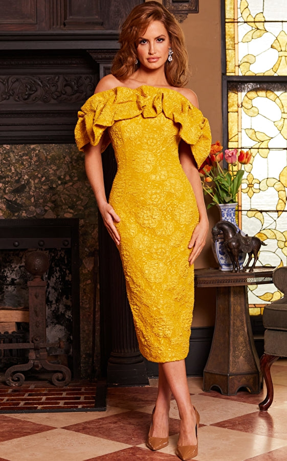 Introducing Jovani 23848: a stunning tea-length gown with an eye-catching off-the-shoulder design. Crafted from a luxurious fitted fabric and trimmed neckline with delicate ruffles, this piece radiates modern-day elegance, bringing a touch of sophistication to your look.