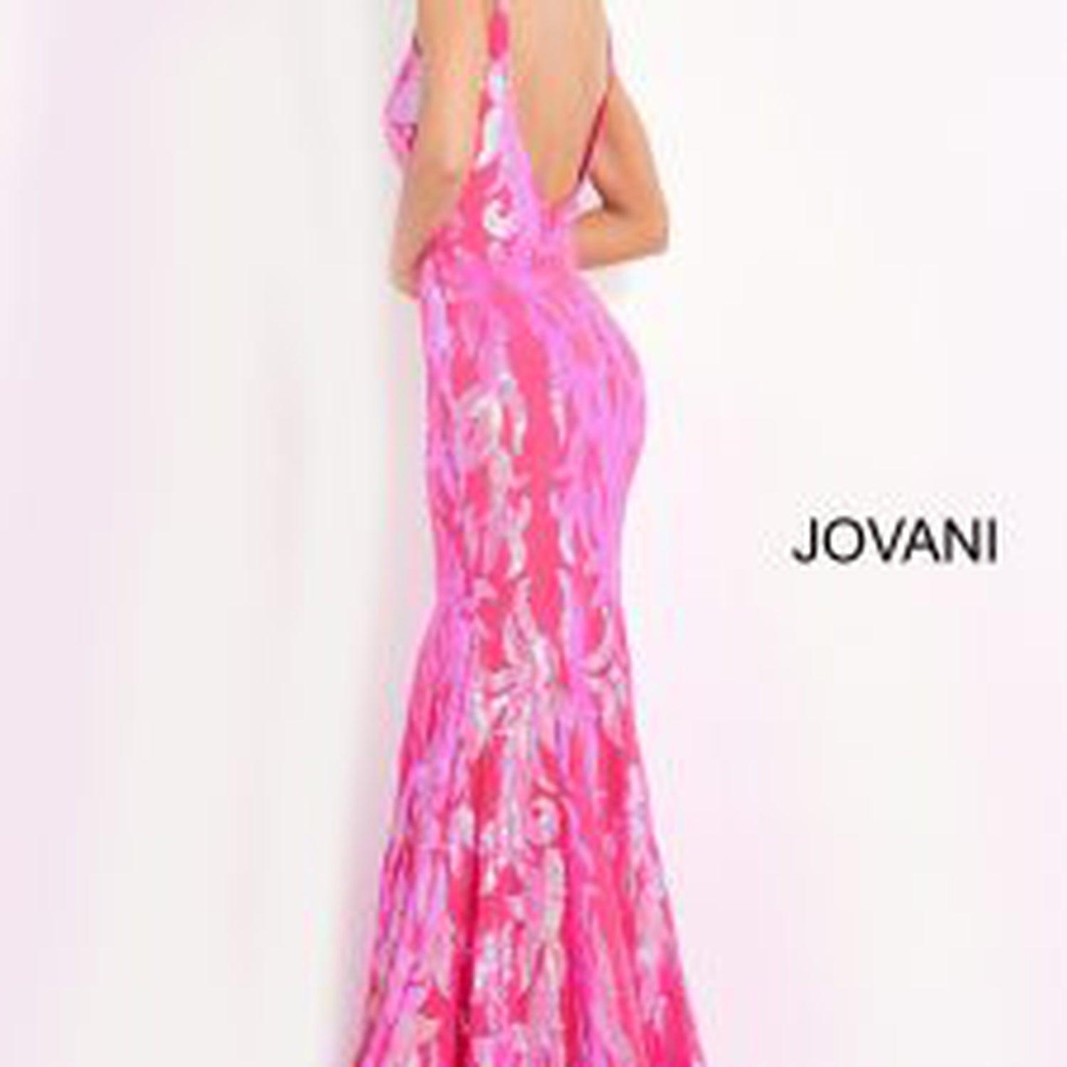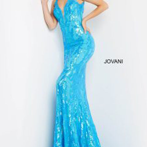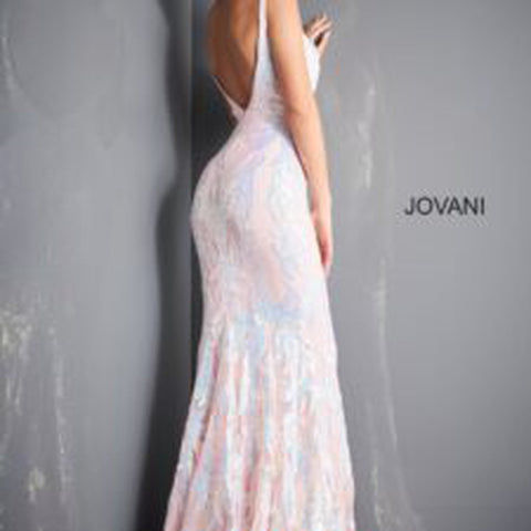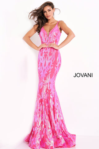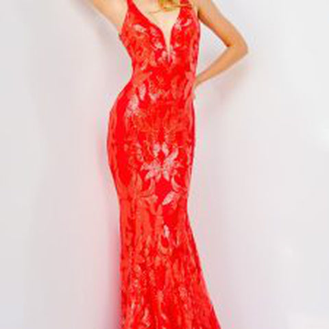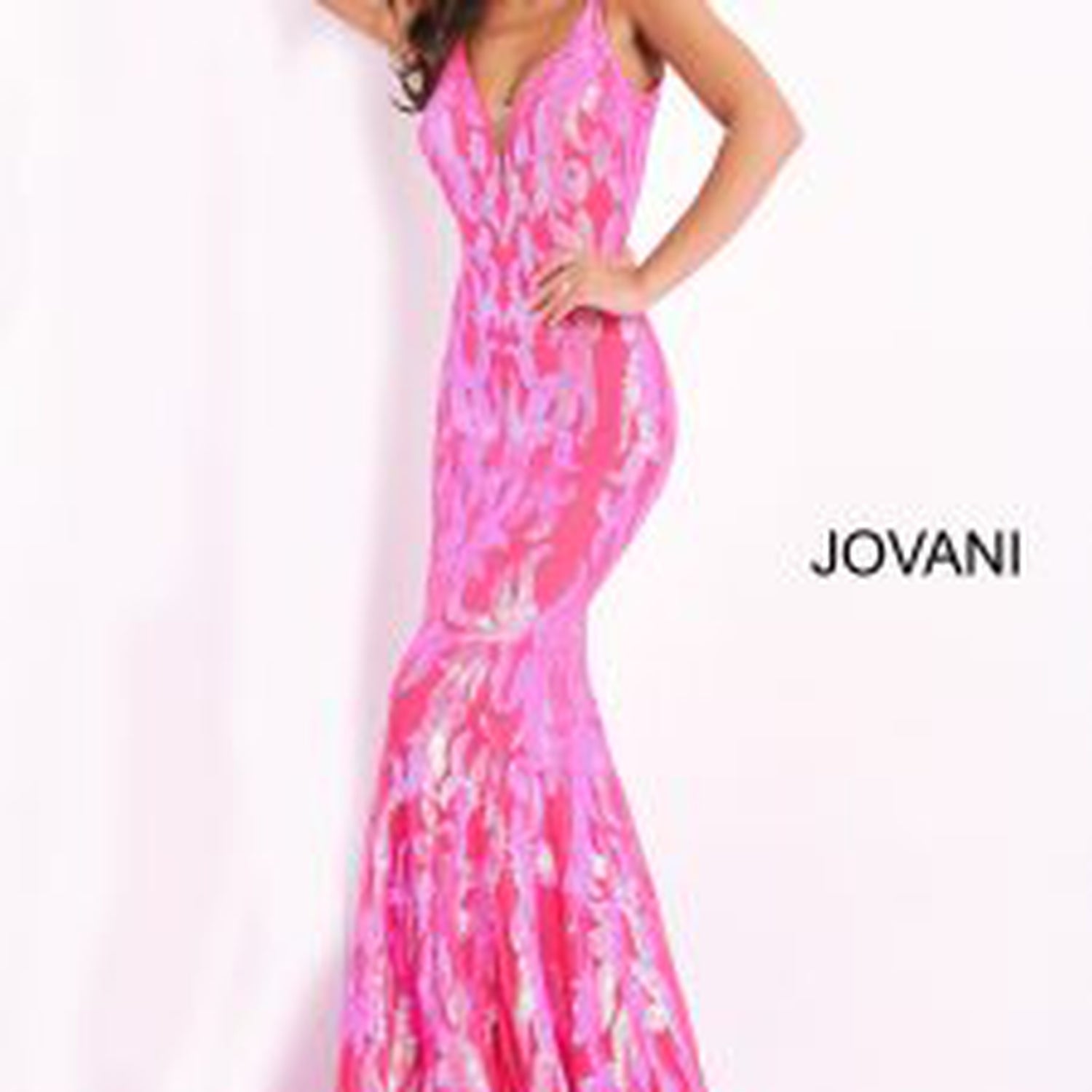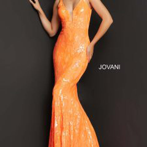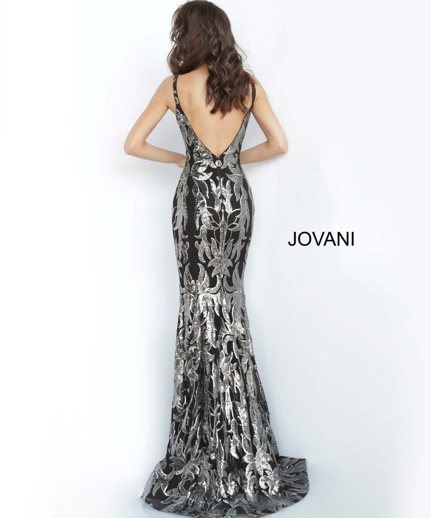 Stay stylish and sleek with Jovani 3263. This long fitted mermaid dress features a damask print sequin embellished pattern for eye-catching sparkle. A plunging V neckline and open V back flatter your figure, while the fitted silhouette gives you a tailored feel. Make an unforgettable entrance with this stunning piece.