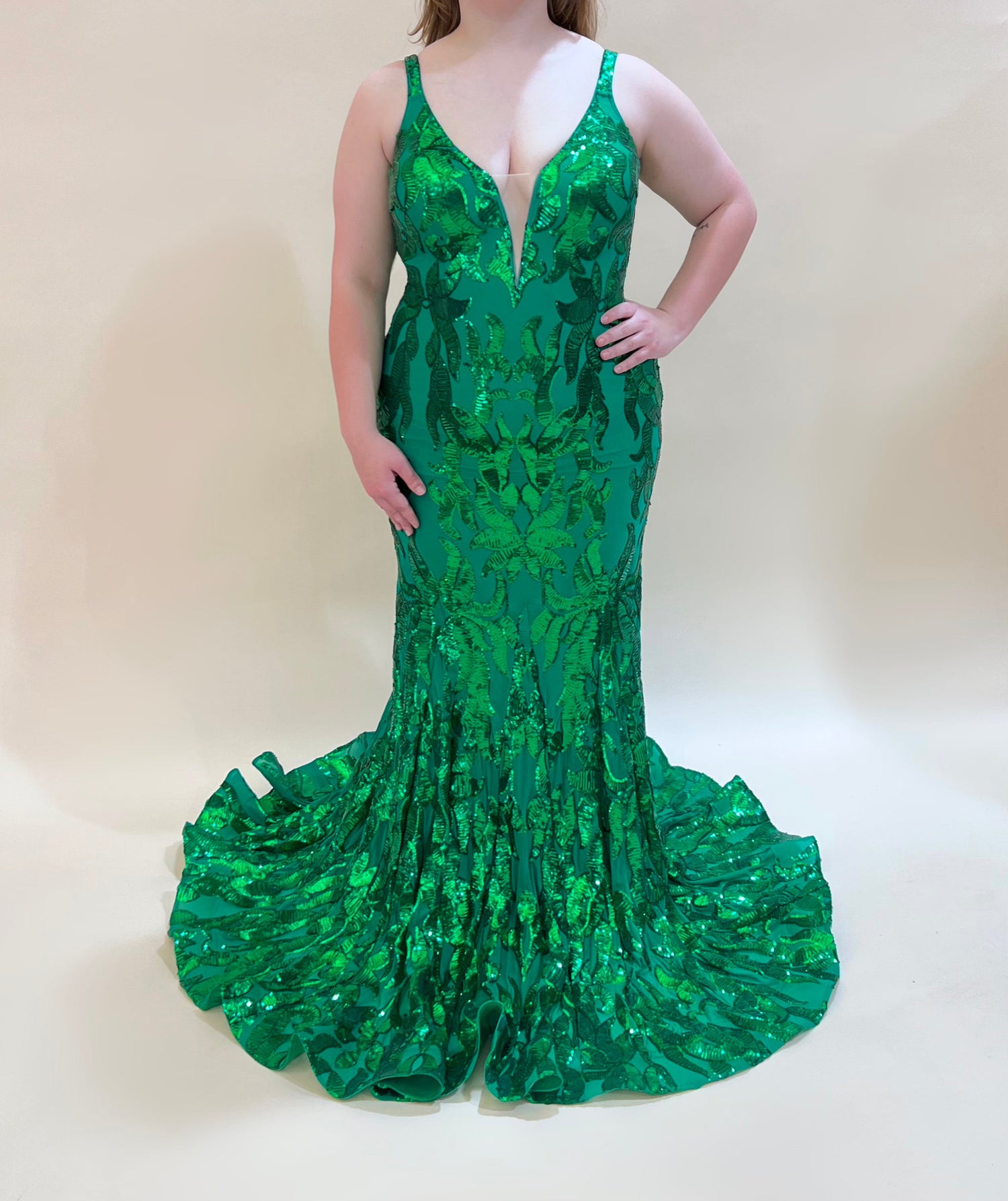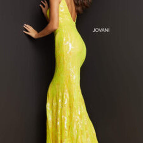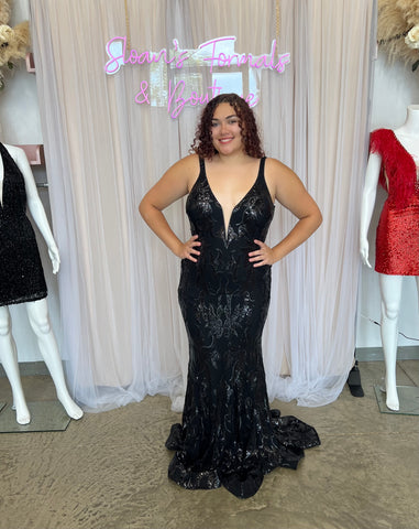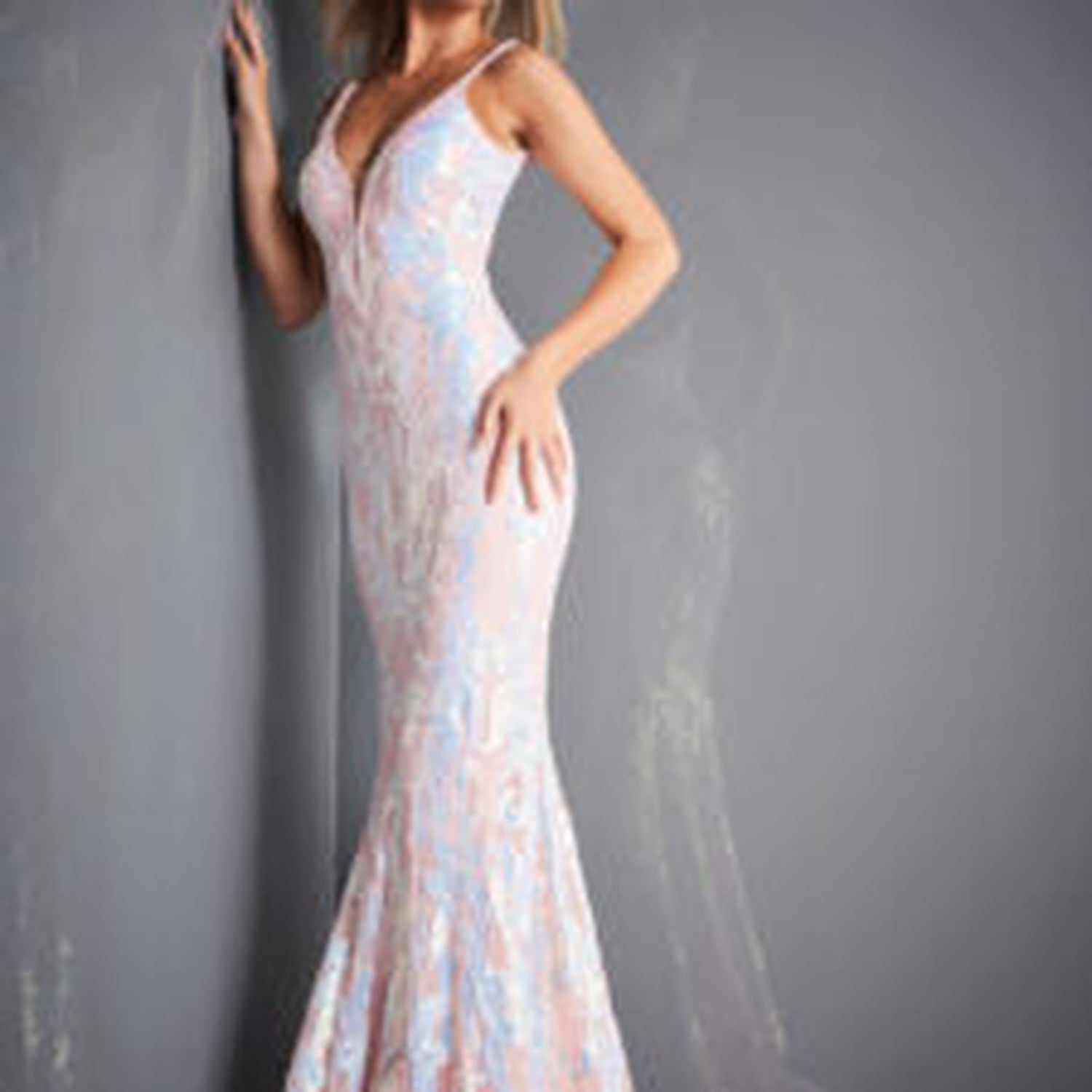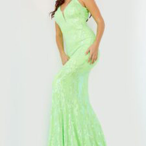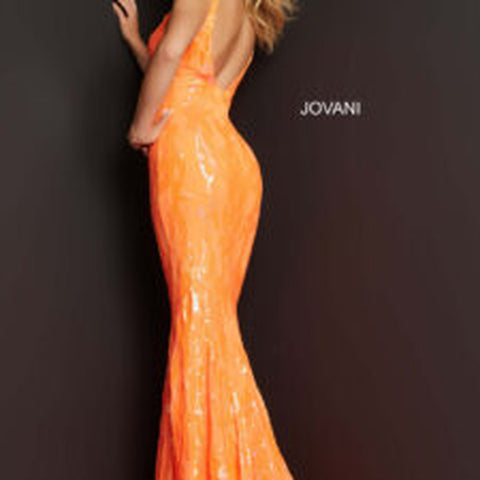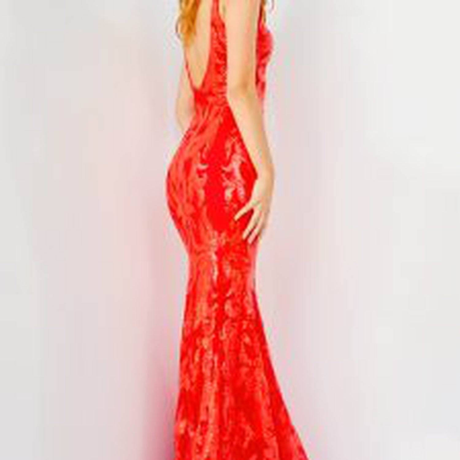 Stay stylish and sleek with Jovani 3263. This long fitted mermaid dress features a damask print sequin embellished pattern for eye-catching sparkle. A plunging V neckline and open V back flatter your figure, while the fitted silhouette gives you a tailored feel. Make an unforgettable entrance with this stunning piece.