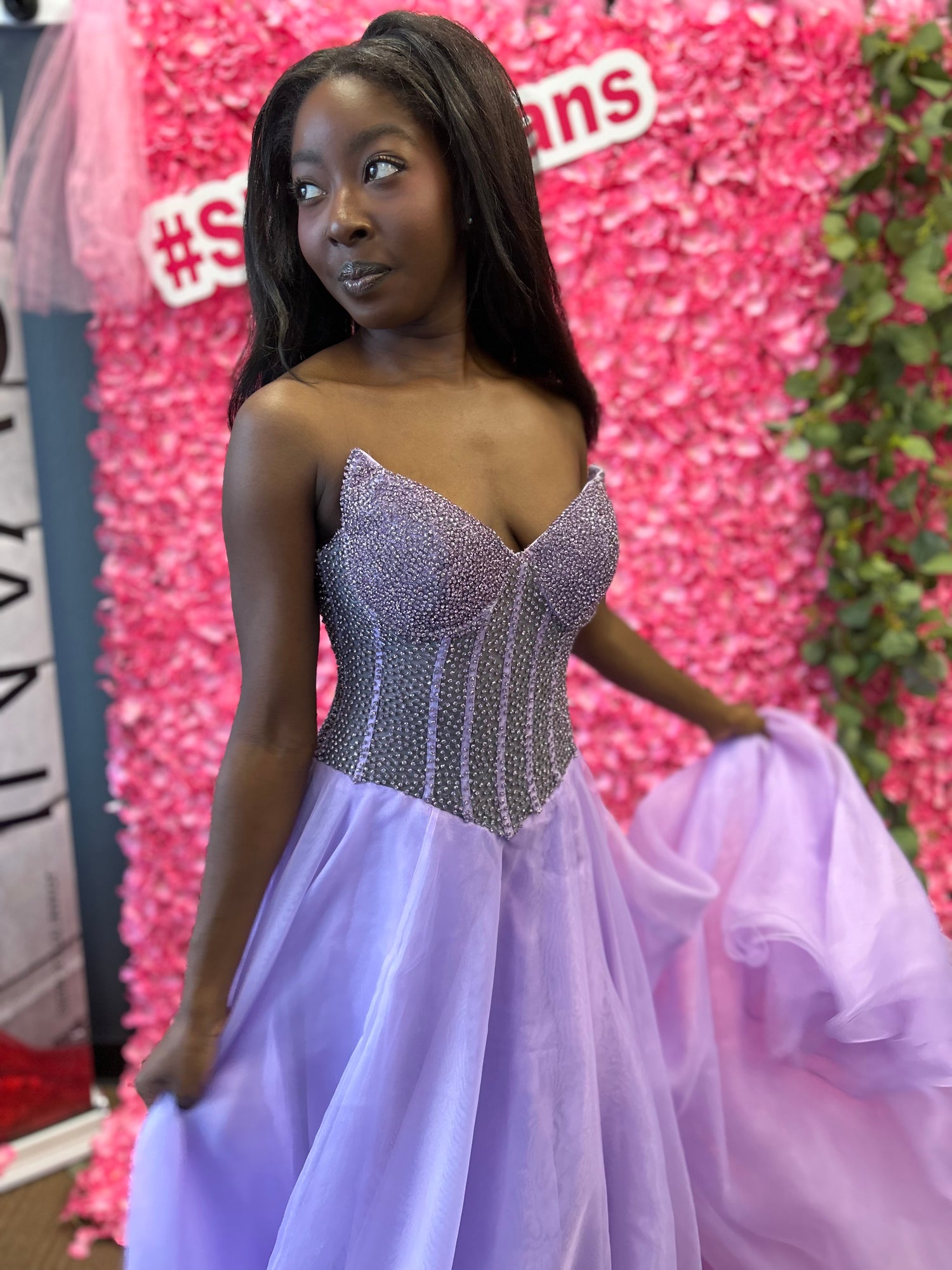 Get ready to turn heads in the gorgeous Jovani 38179 A line dress! Featuring a stunning high slit and train, this floor length dress is sure to make a statement. The beaded corset bodice adds a touch of glamour, while the open back and strapless V neckline create a flattering silhouette. Perfect for prom or pageants!