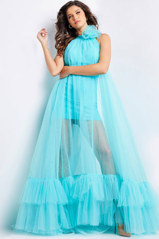 This Jovani 38720 is a short fitted dress with a floor-length overlay so you can look and feel like a princess! The ruffle hem and high neck, accented with a large floral detail, create a stunning and unique look that's perfect for any occasion. Get ready to rock the floor!