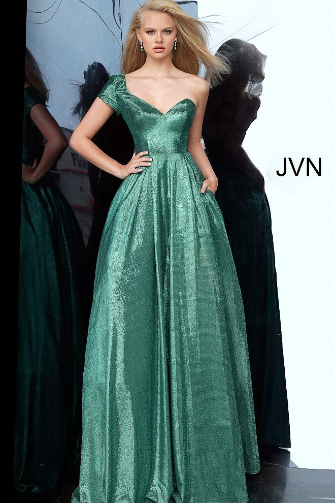 Look stunning in this Jovani JVN4389 dress. This metallic A-Line silhouette with a one-shoulder sweetheart neckline edged with a short sleeve is perfect for formal occasions. Crafted with expert design and attention to detail, it will ensure your look is on trend and unforgettable.