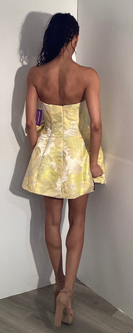 This strapless short formal dress features a charming bow detail and an elegant pattern that makes it perfect for standout occasions. Its flattering silhouette combines sophistication with playful style, ensuring you feel confident and chic at any event. Ideal for those seeking a unique and memorable look.