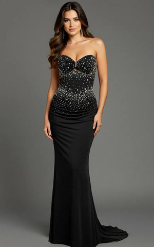 Sleek, sophisticated, and effortlessly glamorous, the stunning Jovani 48372 is a strapless black evening gown designed to shine with understated elegance. This timeless formal dress features a sweetheart neckline with a subtle front keyhole detail, adding a modern touch to the classic silhouette.