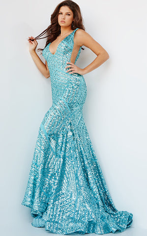 Elevate your look in this captivating Jovani 59762 gown. Featuring a sequin-embellished V-neck and an open back, this long and graceful prom dress will make you feel like the star of the show. Make a lasting impression with this stunning and captivating look.