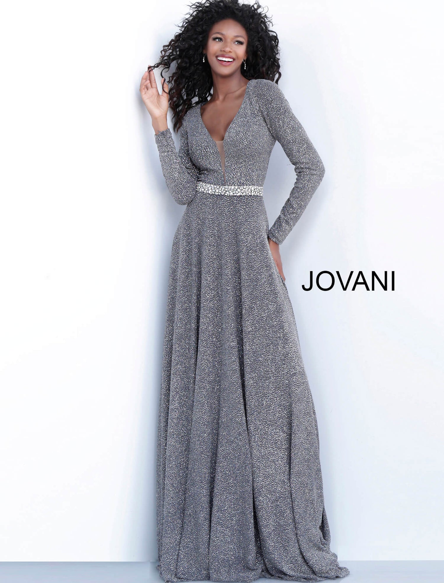 This Jovani metallic glitter prom dress, is a long, formal gown with a sexy, plunging mesh insert neckline. The dress features fitted long sleeves as well as a fitted bodice which is encircled by an embellished belt that hugs the waistline and flatters your figure. The back is closed and hides an invisible zipper closure. The sophisticated floor length gown has a flowy, pleated skirt that ends in a romantic sweeping train. Available in burgundy or silver, the dress’s stretch glitter material will have you sparkling all night long!