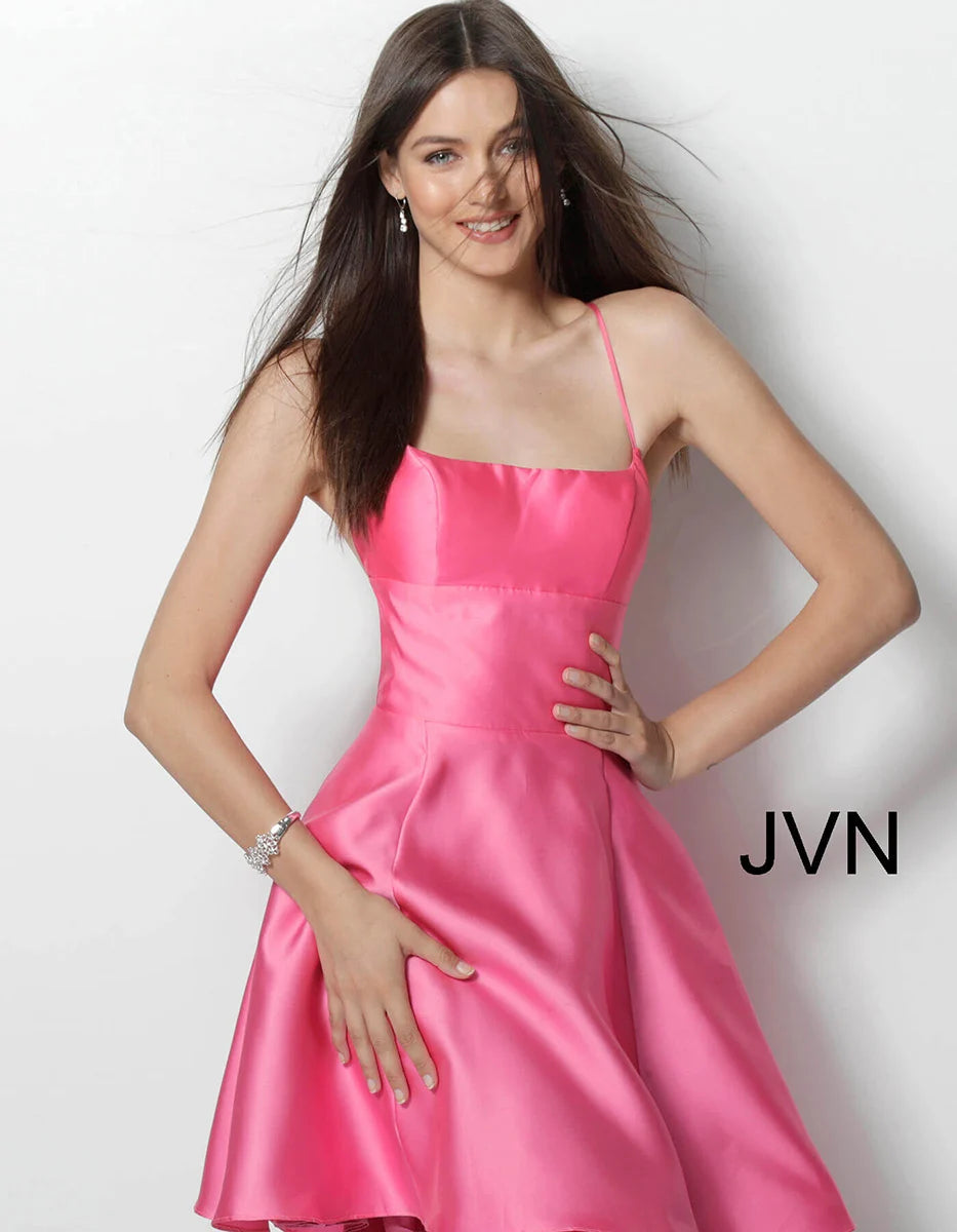 Look perfect at your homecoming dance in this charming JVN by Jovani JVN63018 dress. Crafted in mikado, this A-line dress is designed with a flattering silhouette featuring multiple seaming and spaghetti straps that define its laced-up exposed back. The square neckline adds a timeless touch to your look.