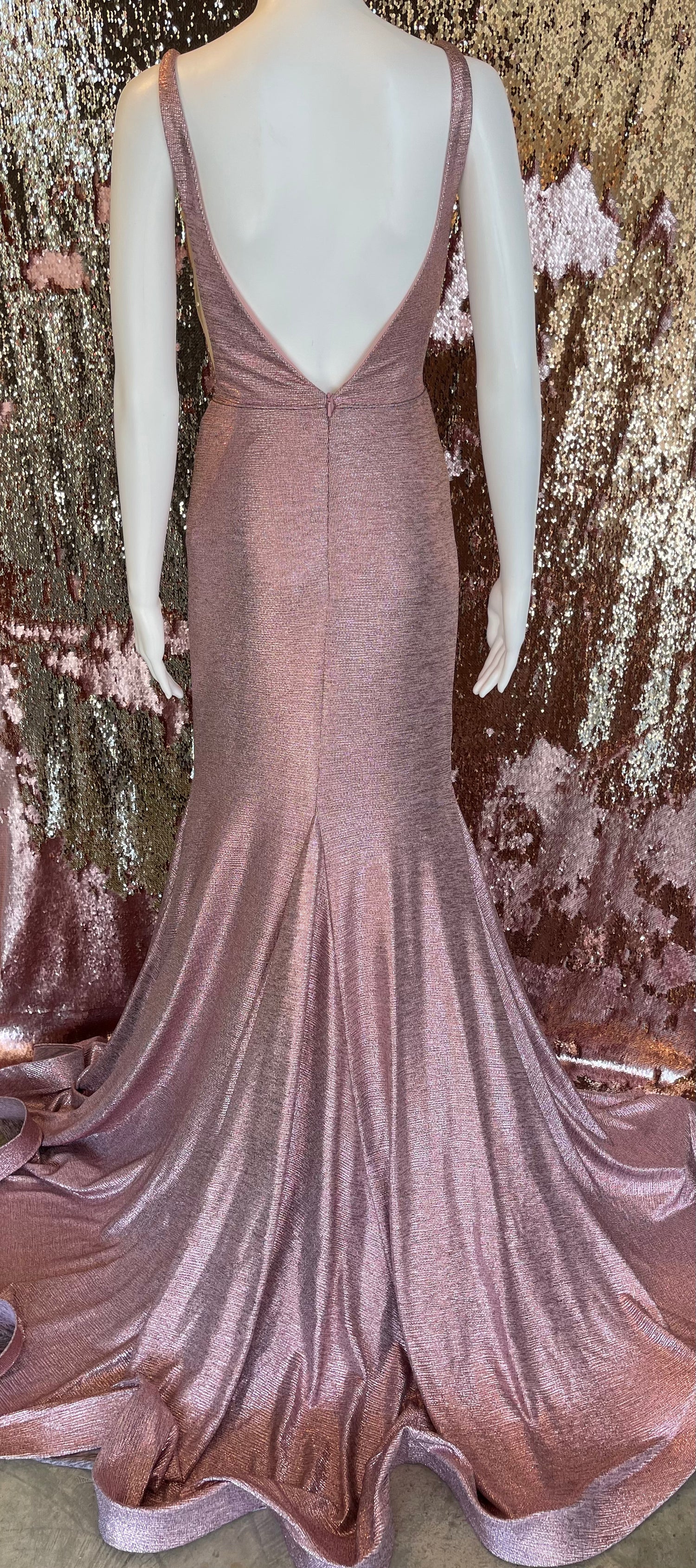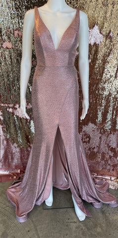Experience glamour and sophistication in Jovani 67963. This metallic stretch gown features a flattering fit and flare silhouette with a plunging V-neckline, sheer side insets, and open V-back, for a stunning and unforgettable look.